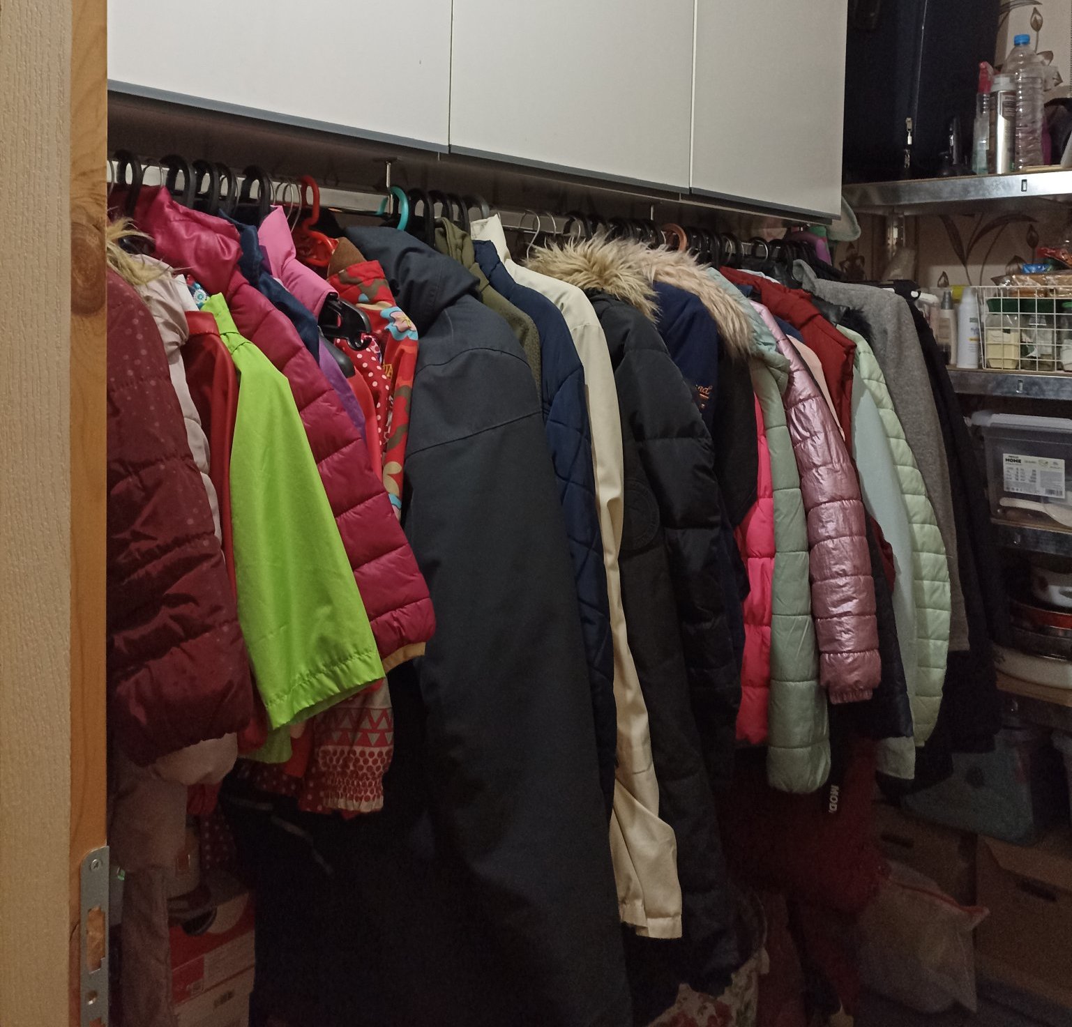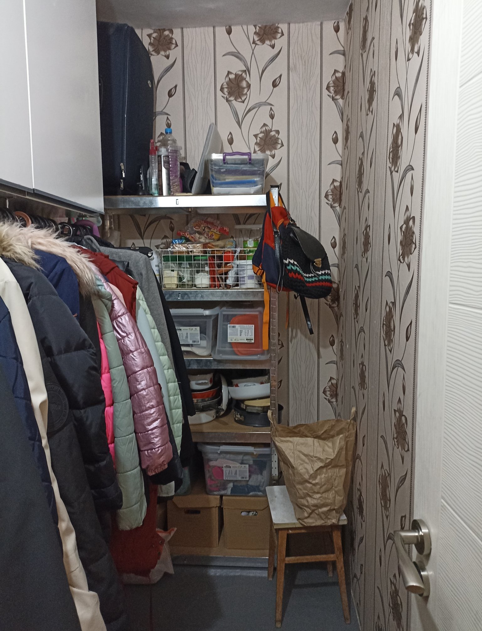 Моят килер е с размер 1.25х2.50 и изглежда ето така. Не е най-доброто, но с този скок на цените май ще си остане за сега така. Лостовете са на дългата стена, но вратата ми е в края. Мъжът ми беше много против, но ние имаме ужасно много якета и не знам къде бих ги събрала другаде. От гледната точка на функционалност, в бъдеще бих ги сложила на късата страна, защото така постоянно се прещипват от вратата.