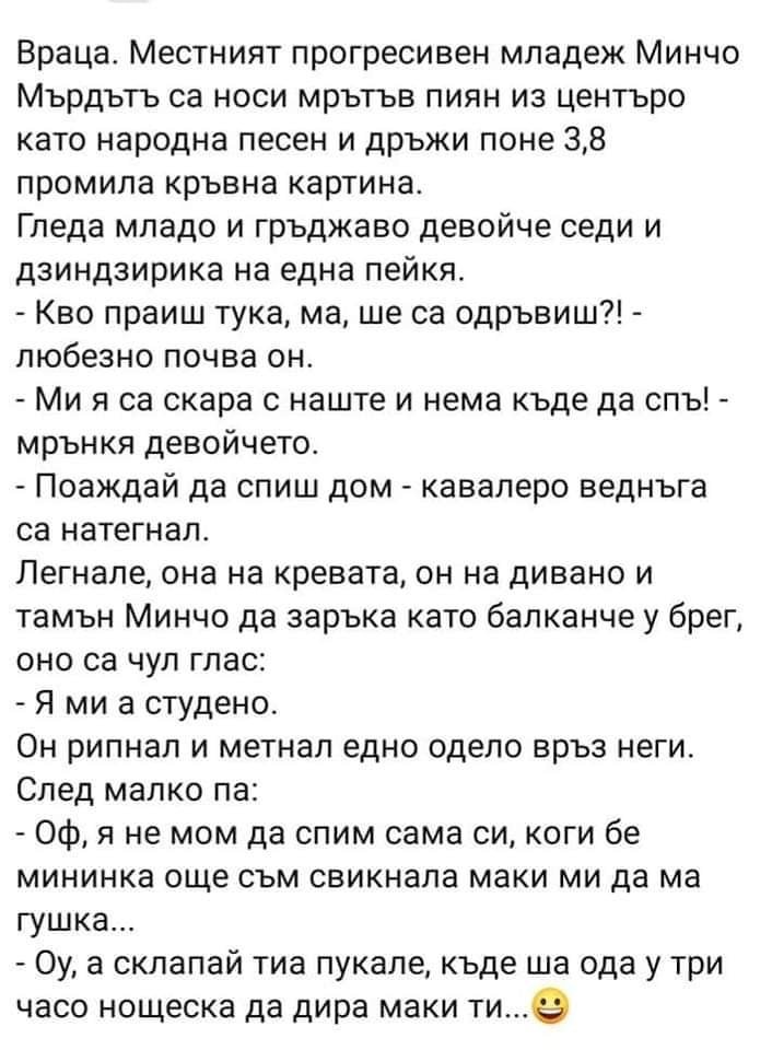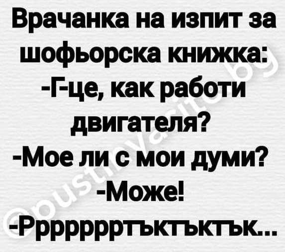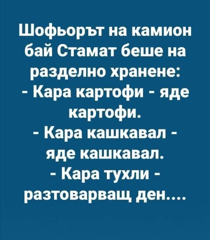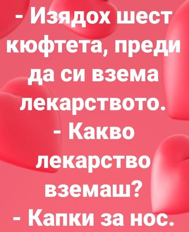 -Скъпи, имам за теб две добри новини. Първата е, че ме назначиха на работа, а втората-не купувай месо, прибирам се с 4кг. вкъщи.