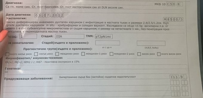 Здравейте! Извинявам се ако въпросът ми не е за тук, но тепърва навлизаме по този път и не знаем към кого да се обърнем, а никой не ни дава информация. Оперираха баба ми от рак на гърдата (ще прикача снимка от протокола), на него са отбелязали, че терапевтичната стратегия включва химиотерапия, ендокринна терапия, лъчелечение и диспансерно наблюдение. От болницата не ни дадоха никаква информация какво следва от тук нататък. Насочихме се към Сити Клиник, защото ни се стори, че за там има най-много добри отзиви. Имаме направление за преглед при онколог, но в Сити Клиник Младост ни казаха, че с направления не работят. Въпросът ми е дали при платен преглед след това лечението може да бъде проведено по здравна каса (от регистратурата там такава информация ни бе отказана)?