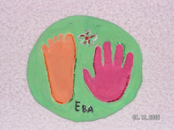 Ние днес бяхме на гости при моята мама и бях взела глина /оказа се кафява/ и направихме отпечатъци на ръчичките  на Велизар и на братовчедите му /кака Теди и бати Вики/. Пробихме две дупчици с клечка за зъби и написахме имената и датата. Изпекохме го във фурната и ние си тръгнахме / забравих да направя снимка/. Кака Тиди вече го е оцветила и е станало много хубаво. Това е подаръка от децата за баба им, която имаше на 5-ти рожден ден. Мама много се зарадва.