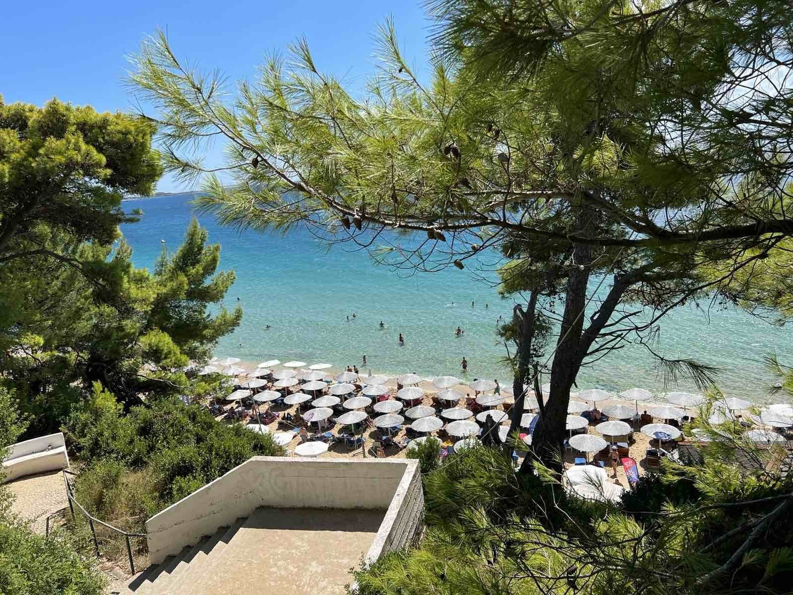 Разкошен е, но гърците брутално прекаляват с чадърите. Слагат ги минимум два пъти по нагъсто отколкото в България, а понякога забравят и за свободни зони. Специално Амолофи в някои части прилича на ………….