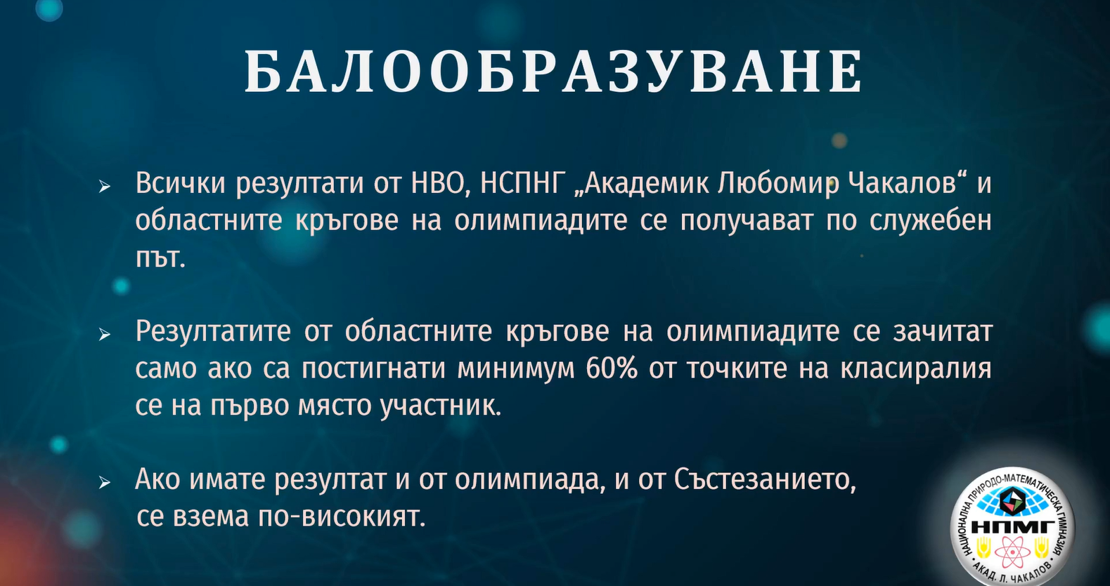 След завършване на началния етап, учениците могат да кандидатстват за НПМГ. Процедурата включва полагане на изпити и участие в олимпиади, като коефициентите от състезанията могат да варират от година на година. Повече информация може да бъде намерена на уебсайта на НПМГ. За да кандидатствате в НПМГ след 4-ти клас, трябва да участвате в олимпиада или състезание на НПМГ и може също така да се изисква представяне на резултатите от националното външно оценяване (НВО) за определени паралелки.