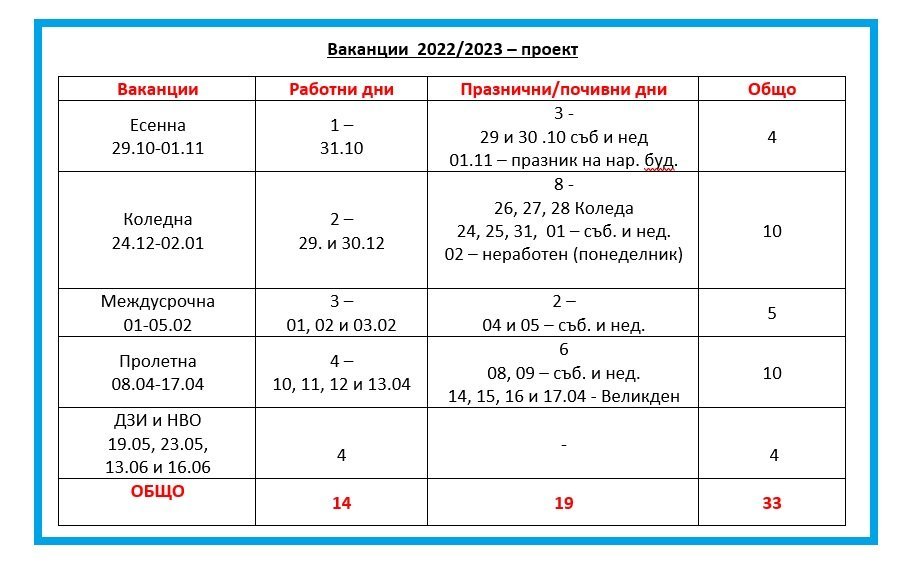 Проектът на МОН за ваканции и неучебни дни през следващата учебна година.