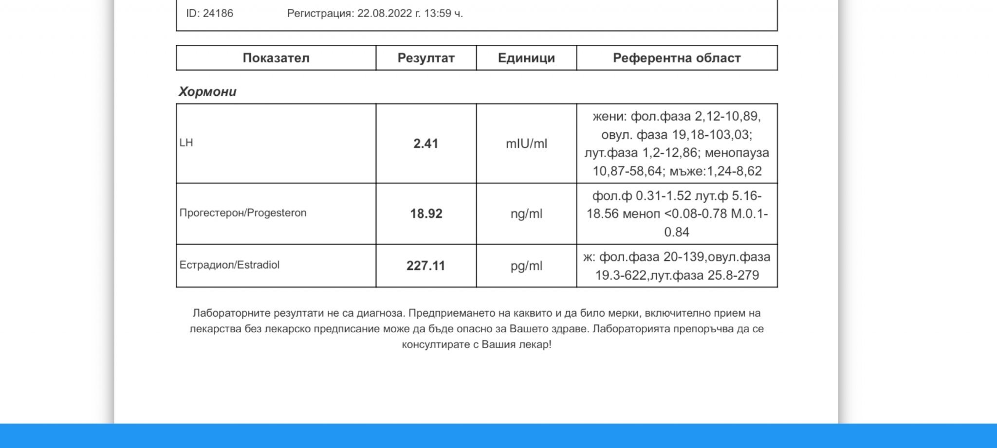 Привет Мария при мен е следното...на 09.08 ми дойде на 10.08 бях на преглед  изследвахме само прогестерона но беше 5.70 и за това на 11.08 повторен беше окей 1.20 и започнах лекарства витамини,1х аспирин, 1х фолиева киселина 1х климара на 5 дни и 2х1 естрофен  на 22.08 съм на преглед и ако всичко е нормално на 25.08 ще правим трансфера