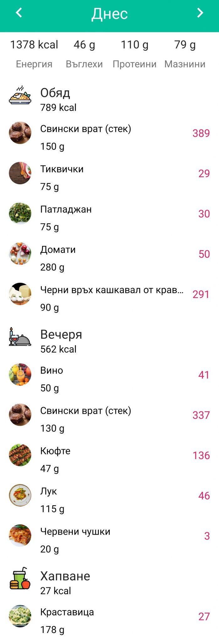 Намерих си хубава програмка на български с пресмятане на калории и макронутриенти. Ето това съм изяла днес, само забравих да добавя зехтина, той ще качи мазнините.