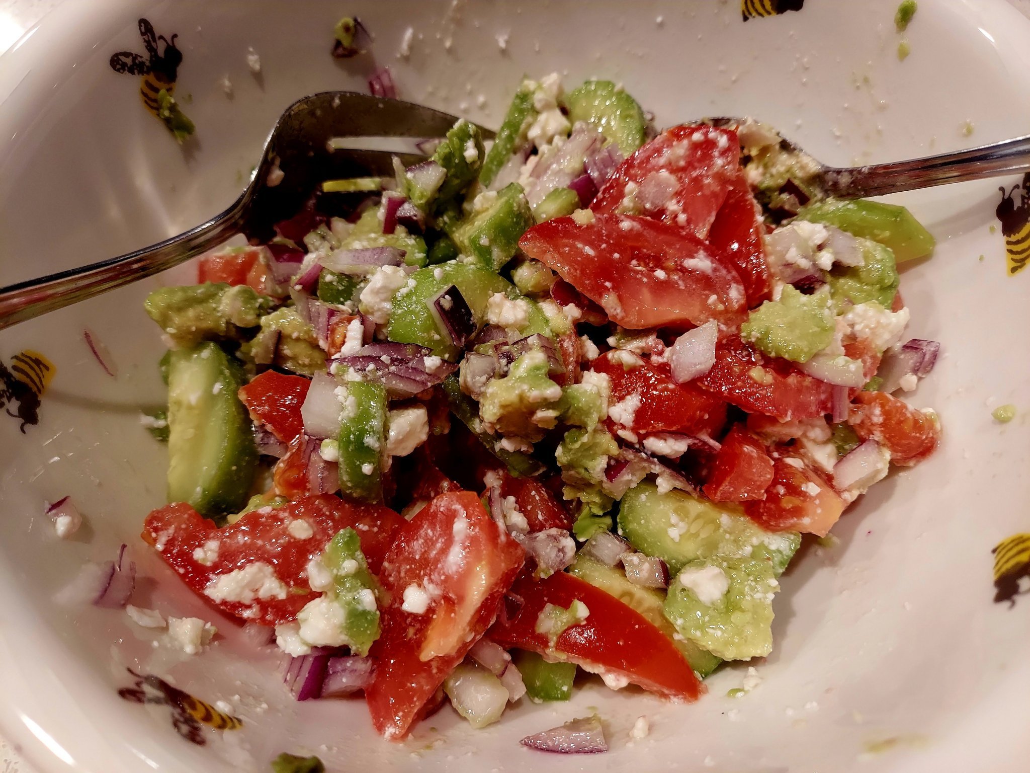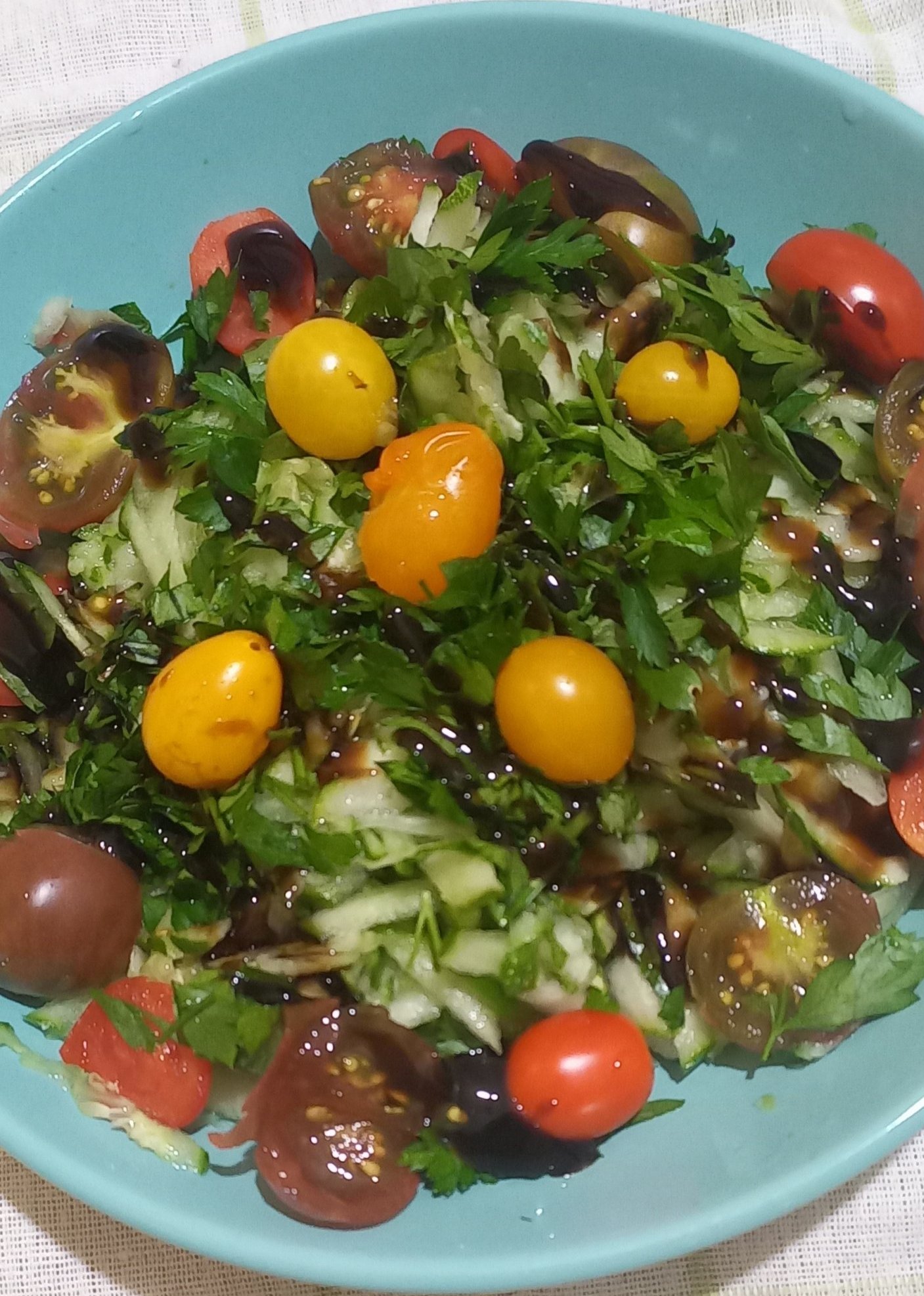 Салата от настъргани краставици, чери домати, магданоз с балсамсамова глазура