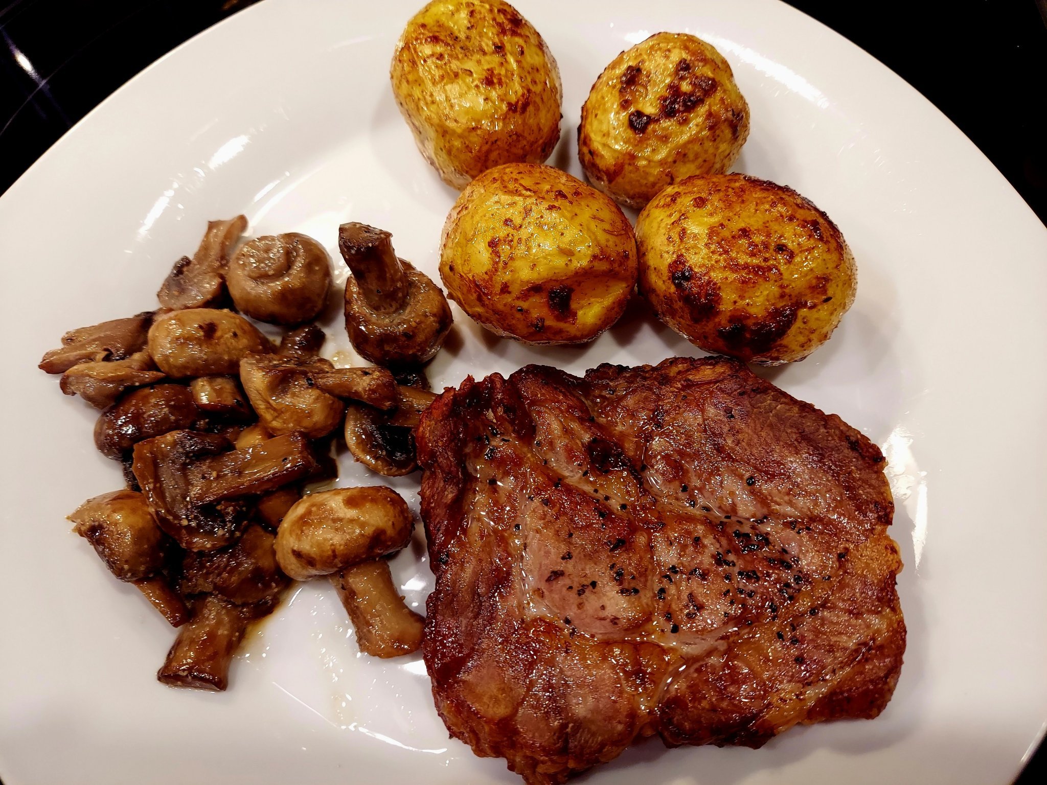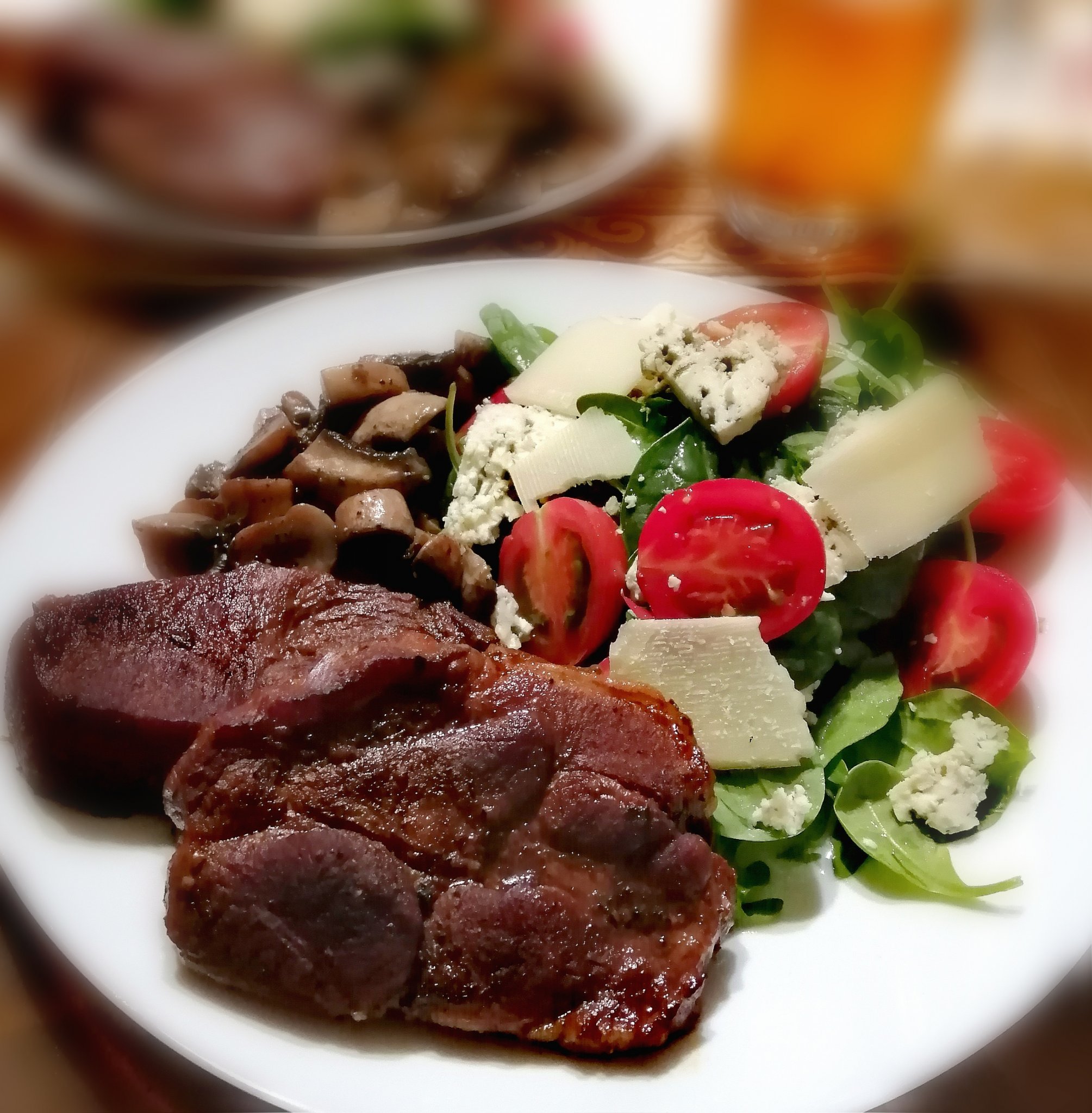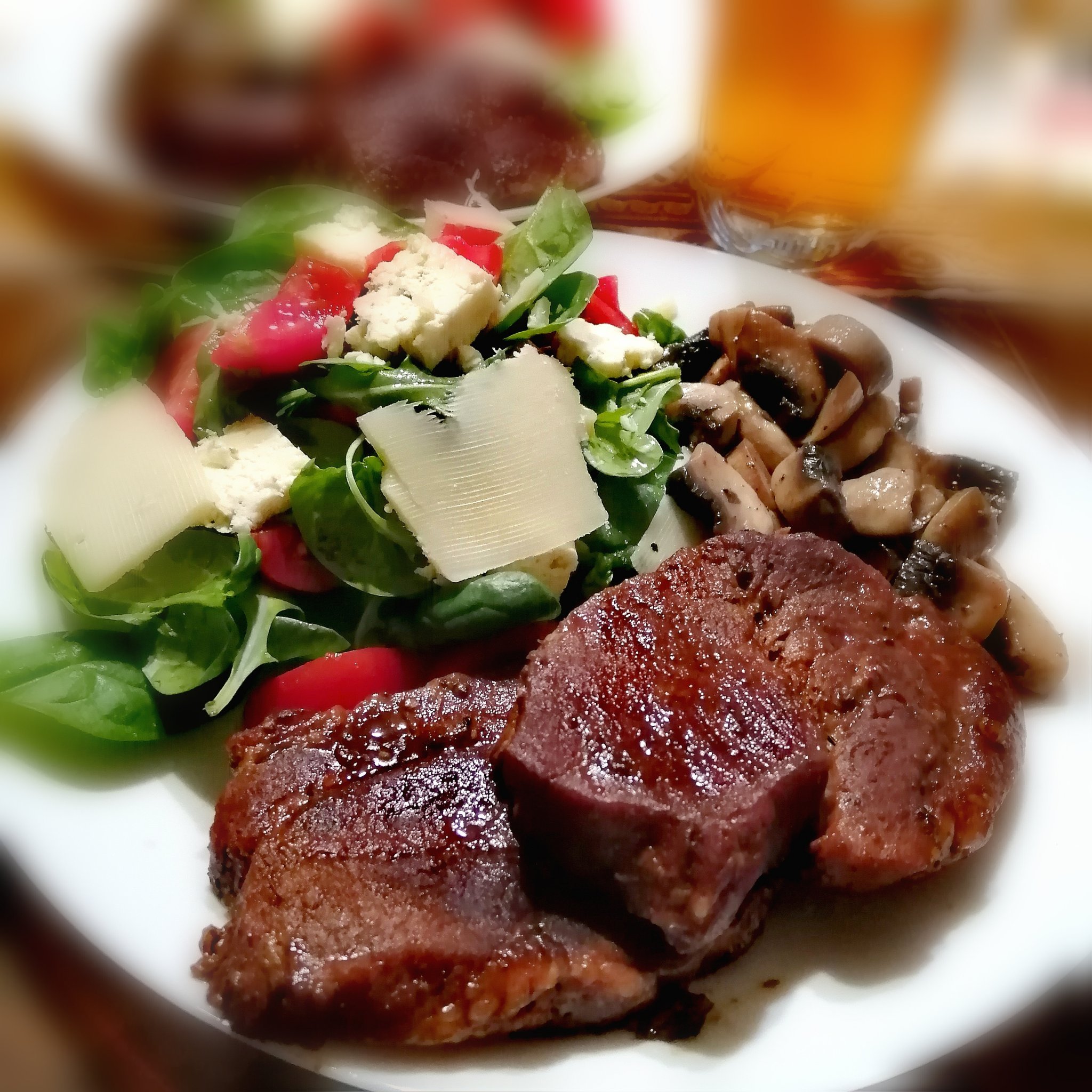 Та тази вечер - Маринован свински врат без кост на фурна(ползвах готова течна марината с уиски, мед и много подправки, нямах и много доверие, но се оказа доста сполучлива), гъби на тиган с масло и зехтин и свежа салата от бейби спанак, рукола, чери, синьо сирене, пармезан, зехтин, лимон, сол, всичко в компанията на студена малцова бира: