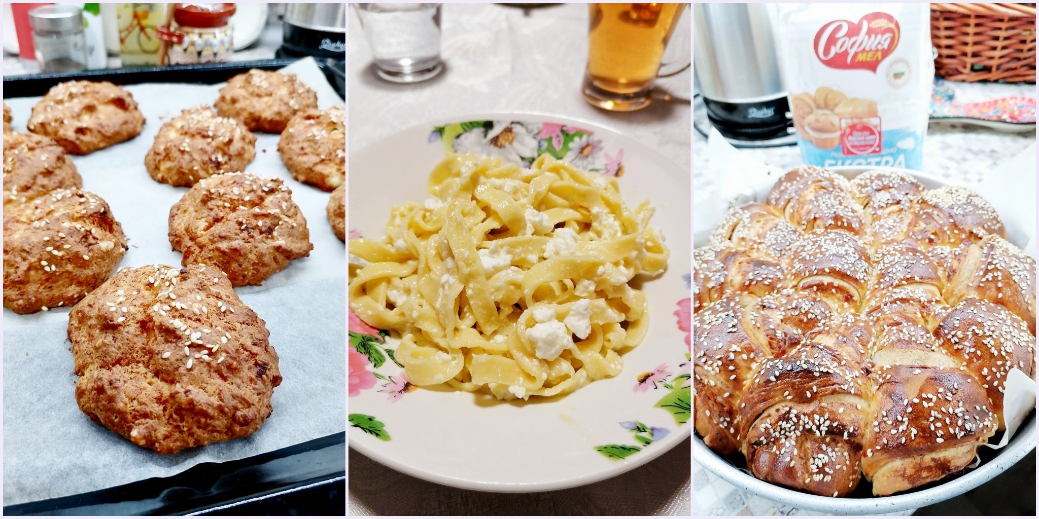 Добруджанки, домашна паста, питка с масло и сирене, с каймак в тестото