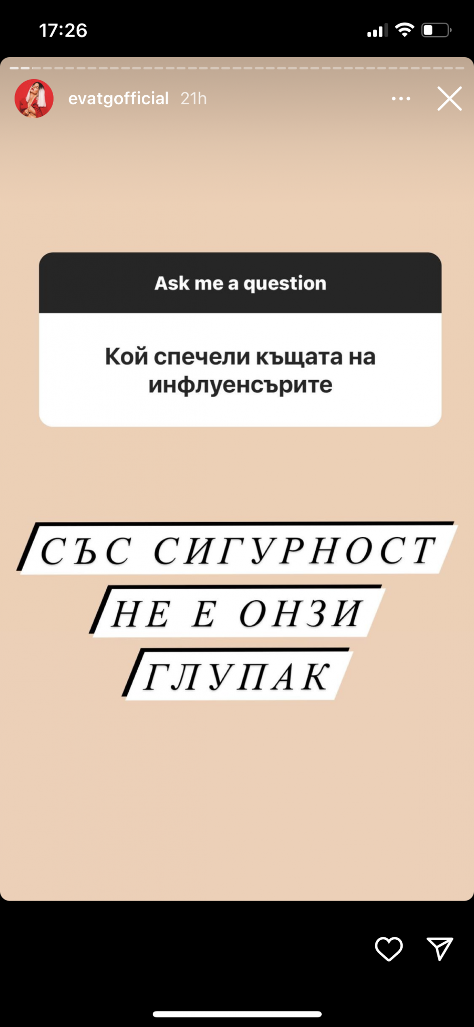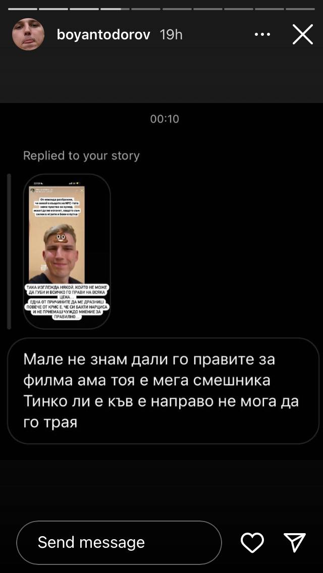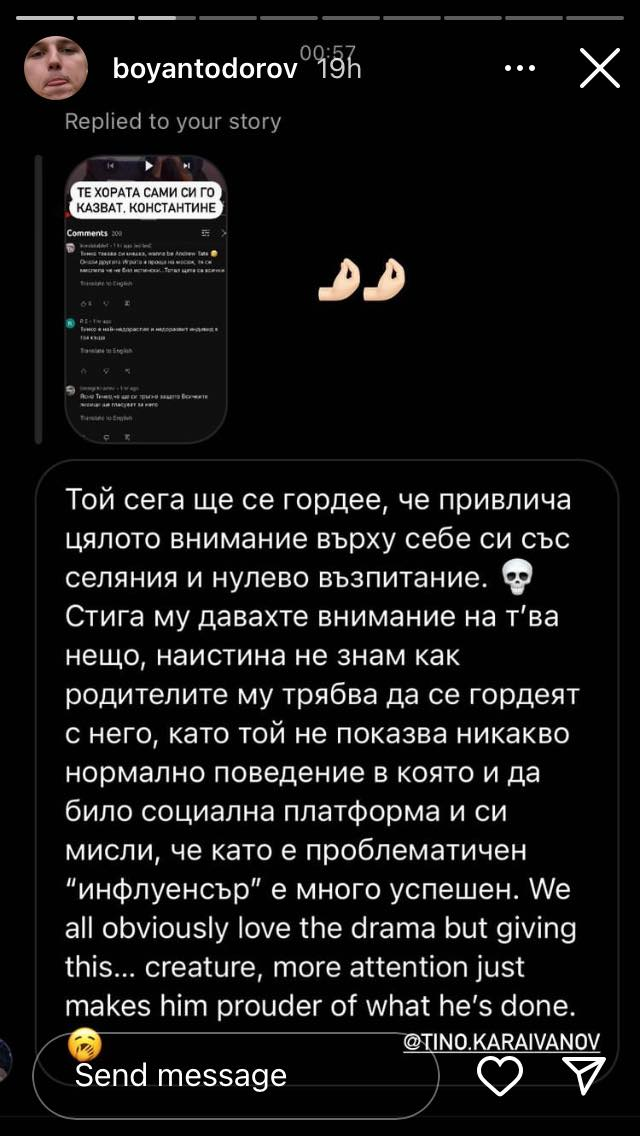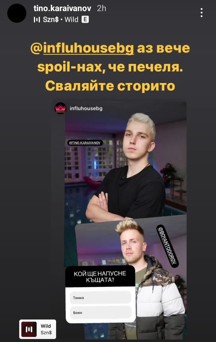 И аз минавам да пусна някоя снимка от техния инстаграм ''скандал'' ,нз дали е нагласено,то нали лоша реклама няма. Някакви детински истории.Боян си сложил снимка на Тинко,Тинко на майката на Боян Grinning На едно от сторитата се вижда ''така изглежда някой ,който не може да губи..блабла'' ,дали не намекват ,че Тинко си заминава в понеделник,нз.. Grinning