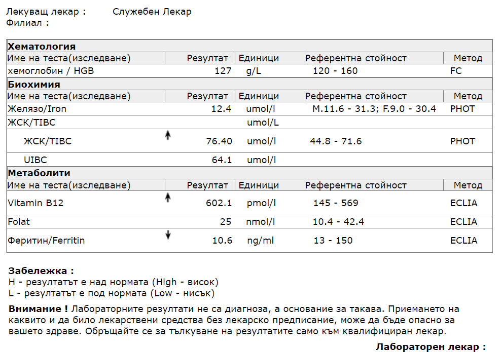 хемогл. 145       желязо. 23      б12- 220   фолат 7,3   в Д 77