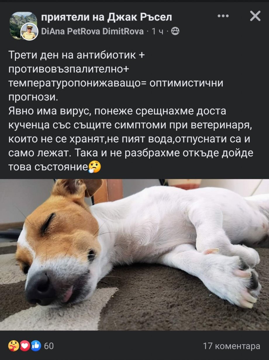 Ant G, виж какво току що ми попадна от Джак ръселската група по повод вашите симптоми - пише, че е вирусоподобно, кученцето е на антибиотик и температуропонижаващо.