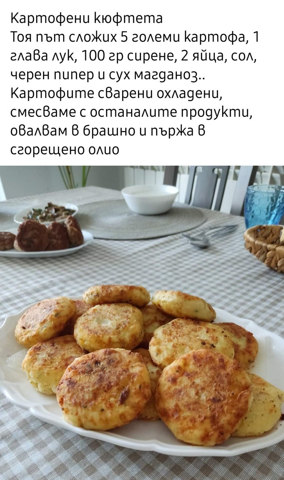Аз тези дни правих картофени кюфтета. За пръв път реших да изляза от класиката с пърженето. Част от тях ги направих печени на хартия, другите - пържени както обикновено. Ами пържените повече си ни харесват на всички вкъщи. Не е здравословно, ама аз и без друго ги правя 2-3 пъти в годината, а друго пържено почти не ядем, та дреме ми. Но като го гледам това злоядото как се връща към предишните си хранителни навици, май ще ги правя по-често, че тях поне ги яде.