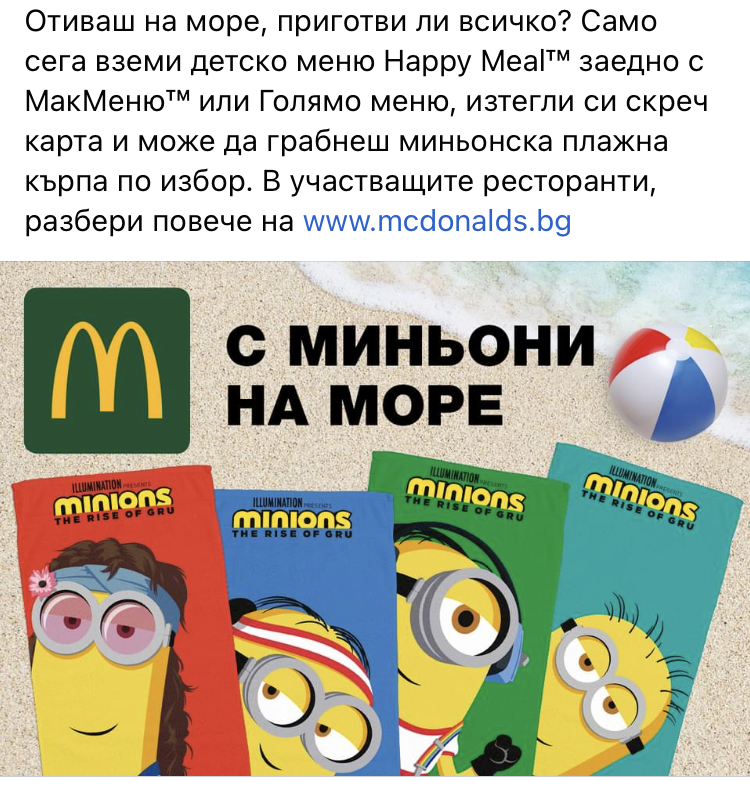 Не мисля, че е споменавано досега, но Макдоналдс имат игра в момента - случайно видях вчера. При закупуване на детско меню, дават скреч карта и се печели плажна кърпа. Аз видях наградите изложени и ги попитах какво е това, та тогава се сетиха да ми дадат карта  и спечелих , много е хубава кърпата.