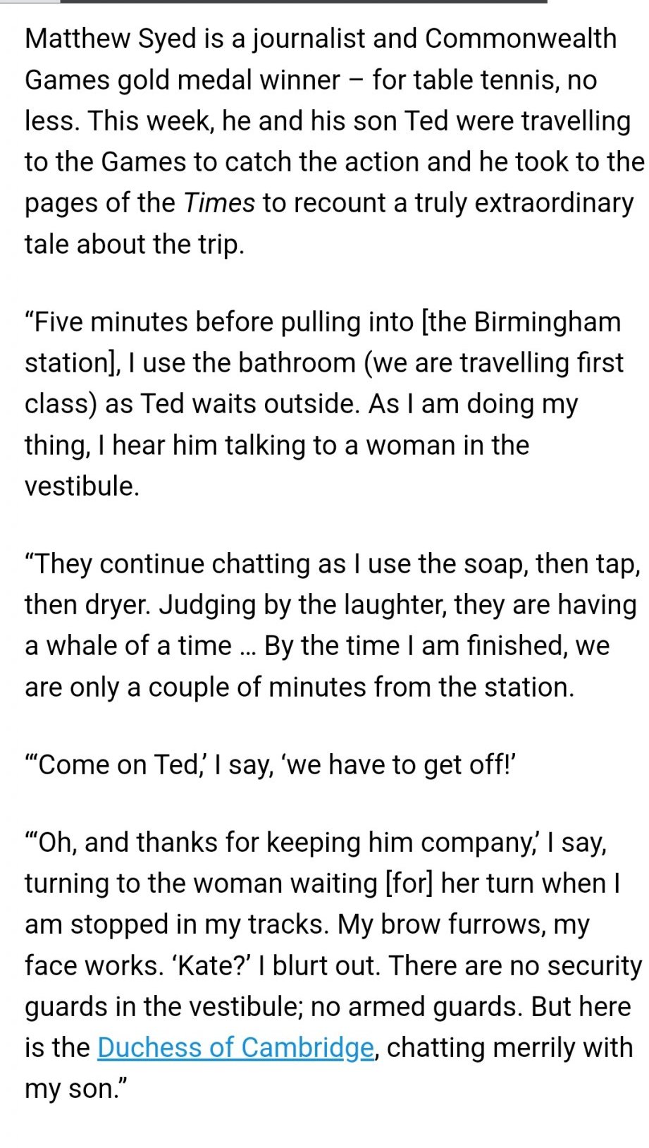 „О, и благодаря, че му правите компания“, казвам, обръщайки се към жената, чакаща [да] реда си, когато ме спират. Веждите ми се сбръчкват, лицето ми работи. „Кейт?“ избухнах. Във вестибюла няма охрана; няма въоръжена охрана. Но ето я херцогинята на Кеймбридж, която разговаря весело със сина ми.“