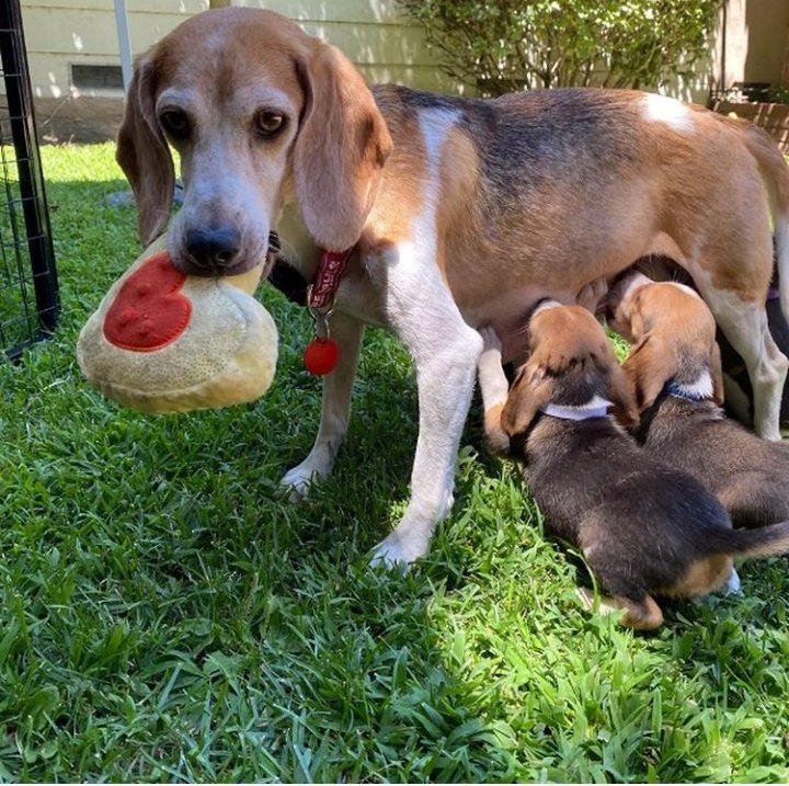 На снимката е с поредните си малки. Много е хубава, а вече ще бъде, свободна и щастлива. Хубаво е, че осиновяват и то възрастни кучета.