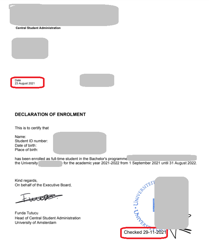 Дъщерята завърши тази година 3 години бакалавър и магистратура в Ротердам, в София е от месец, остана да си вземе дипломата за магистратурата през октомври. През всичките години, без последната, си е сваляла като отиде за началото на учебната година от сайта на Еразмус уверението за енролване - на холандски и английски е бланката, превеждал съм го при заклет преводач и е носено за да й отметнат годината, така, както е записано в документа - от септември текущата до септември следващата, за учебната година.