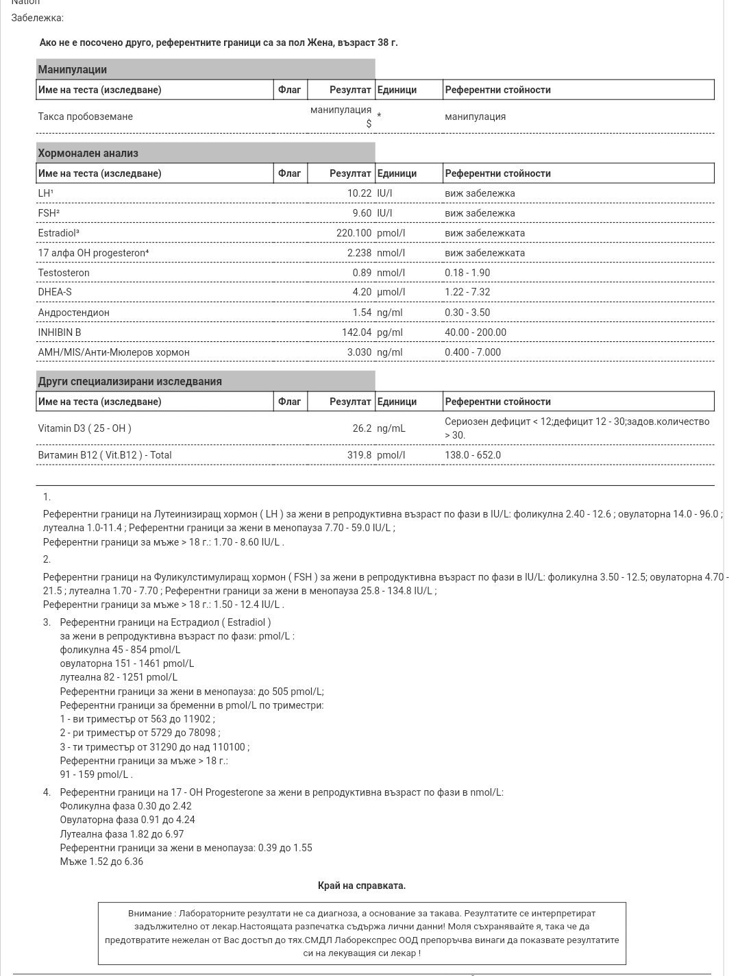 denis, не съм писала в темата повече от година, защото бях бременна и вече си имам момиченце Simple Smile (само да вметна, че съм с поликистоза и ИР, и преди да забременея много често следях хормоните). Но днес пиша по повод изследвания на майка ми. Тя е на 46г и от 2 месеца има малка кистичка на единият яйчник, както и 2 месеца предизвикване на МЦ с Дуфастон. Днес на 3-ти ден от МЦ пусна тези изследвания: