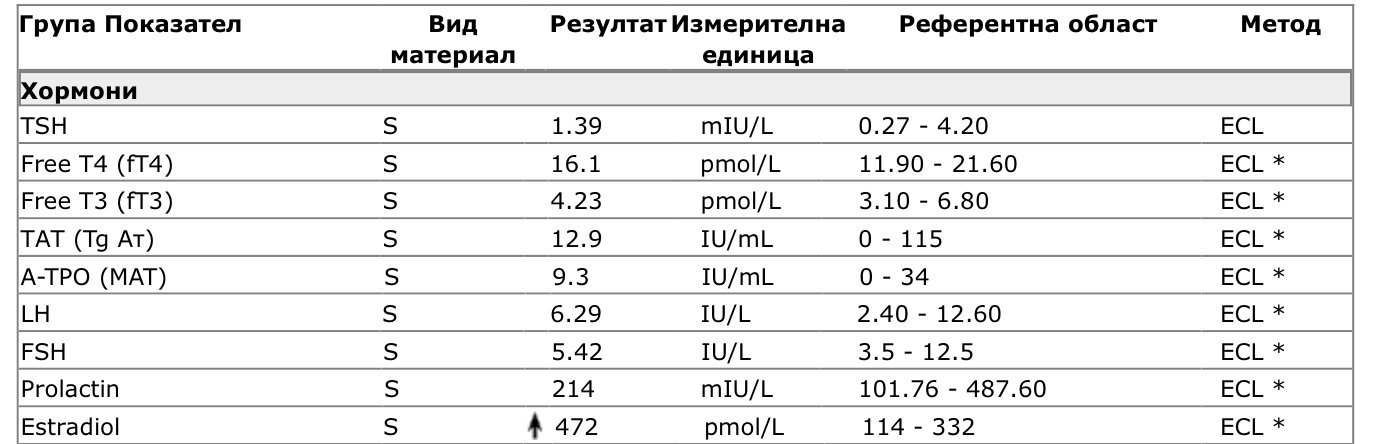 Изследванията са пускани на 4ти ден от МЦ...МЦ ми е 28-30 дни...редовен,но от около 5-6 години оскъдно кървене около 2 дни...никой от гинеколозите не го е сметнал за проблем,че е само 2 дни...на 33 съм...с базед от 18 годишна...от доста години са ми в норма хормоните,като си ги поддържам с минимална доза тирозол...