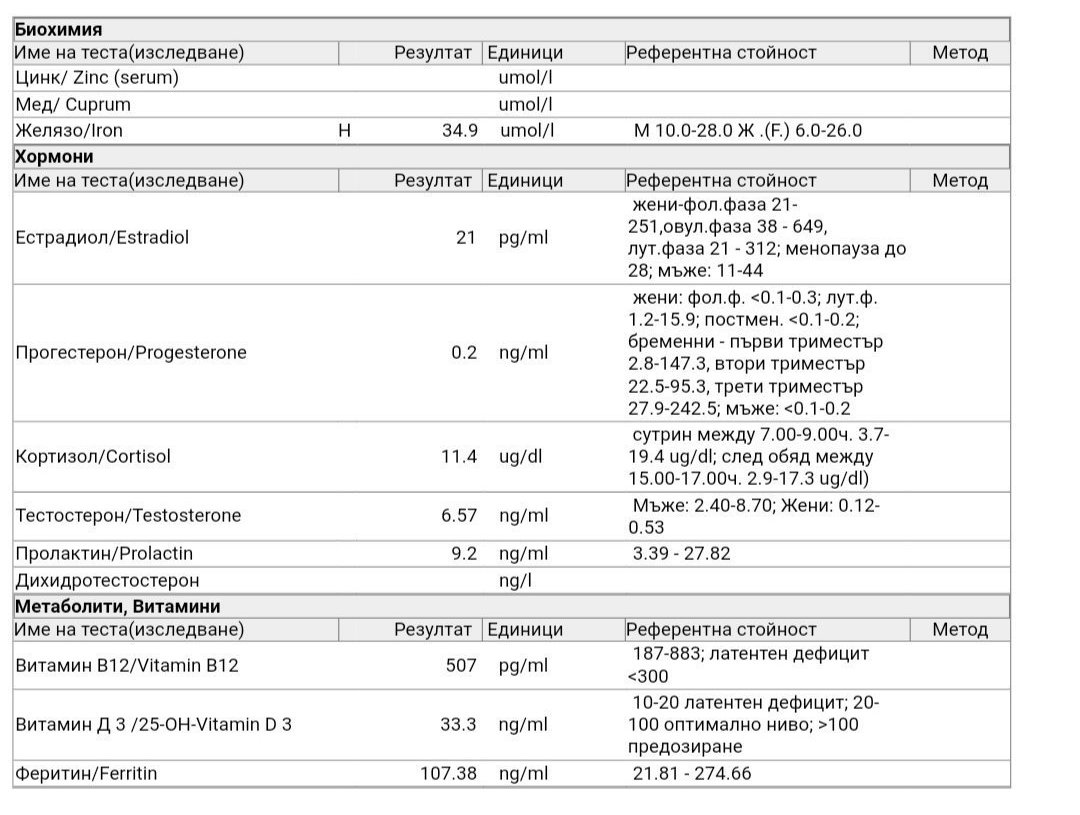 Здравейте, Денис! Какво е мнението Ви за тези изследвания? Пуснах ги във връзка с умора, косопад и нервност, които се появиха преди няколко месеца.  Кърмя от 2 г. и половина и нощният ми сън е неравномерен и накъсан. Предполагам, че имам и дефицити, но съм спряла витамини и добавки за 15-20 дена и тогава ще изследвам стойности на витамин д, б 12 и феритин. Благодаря предварително!