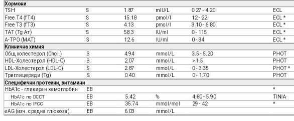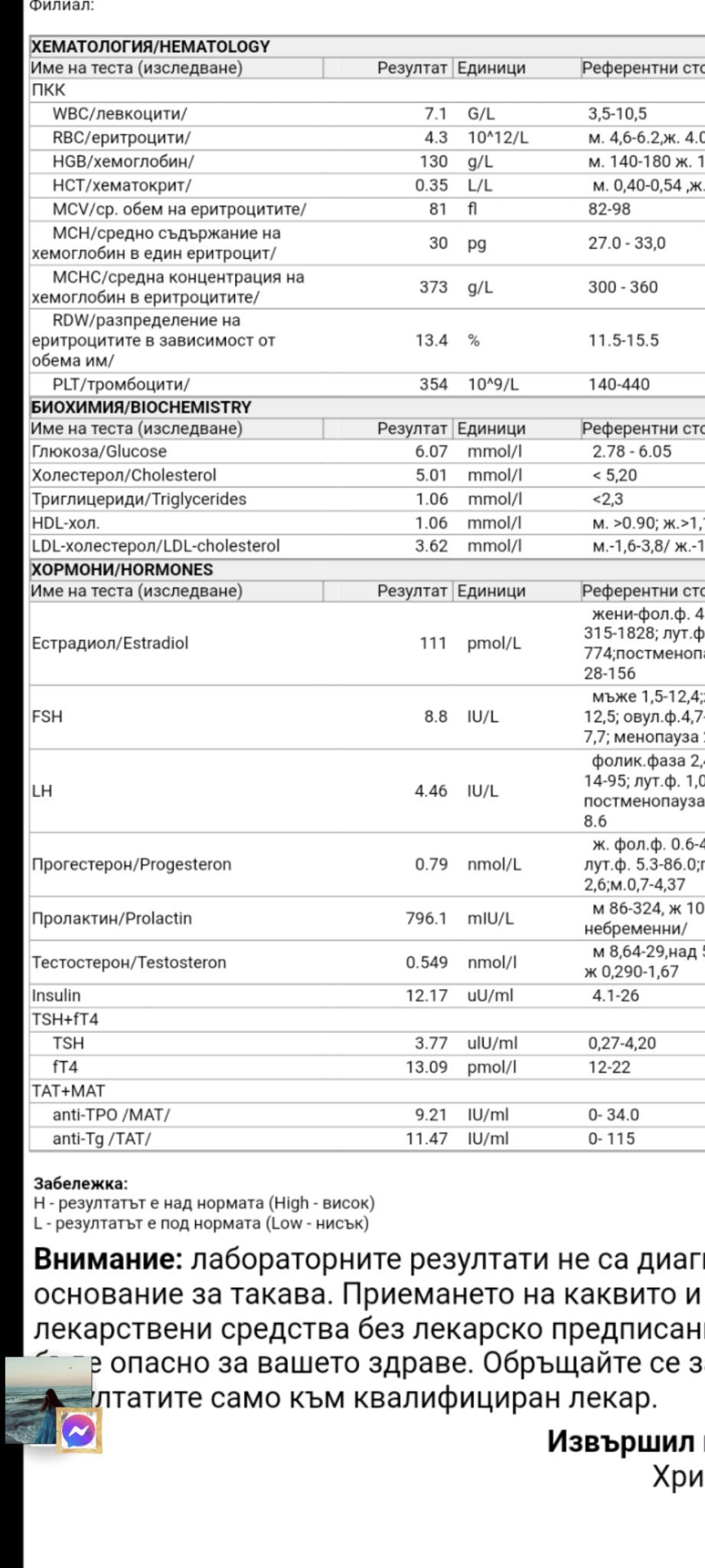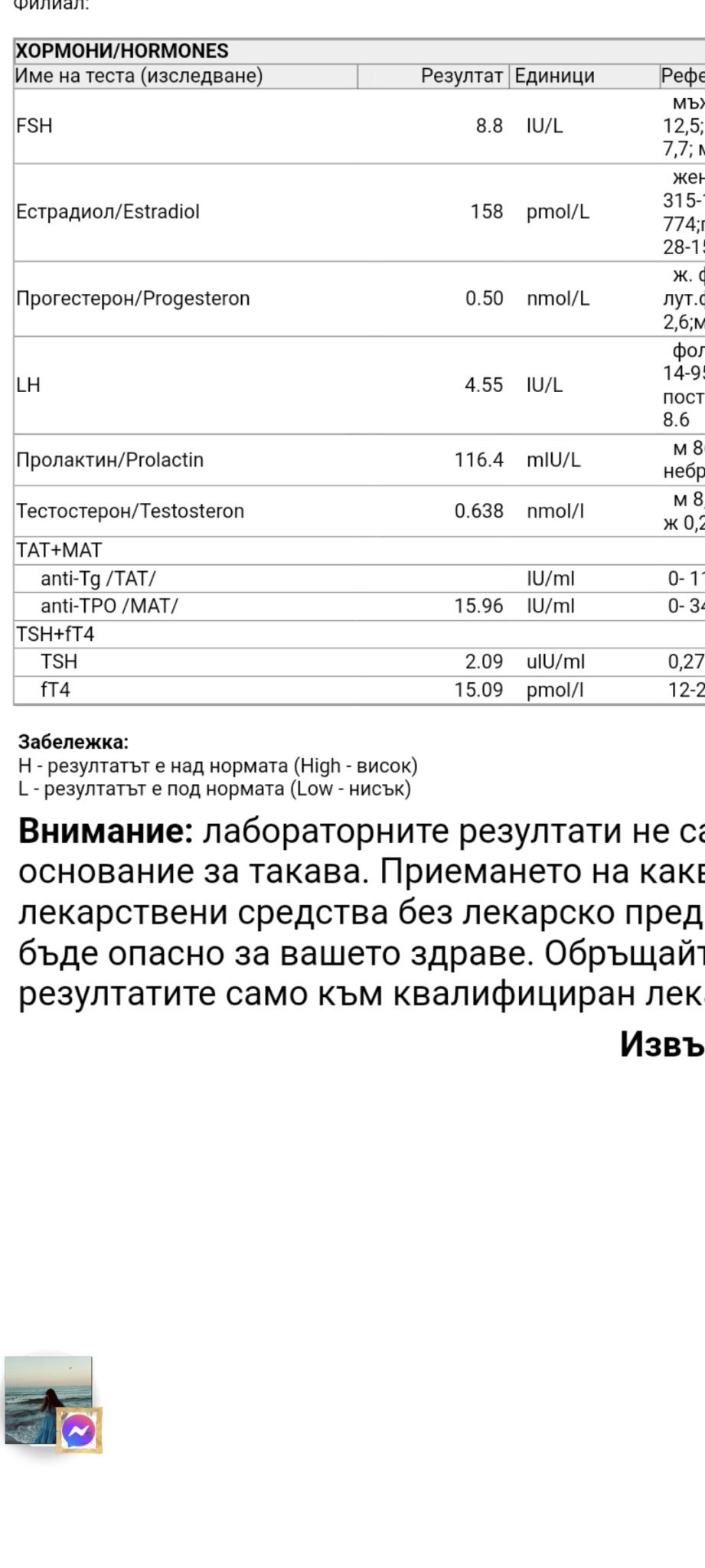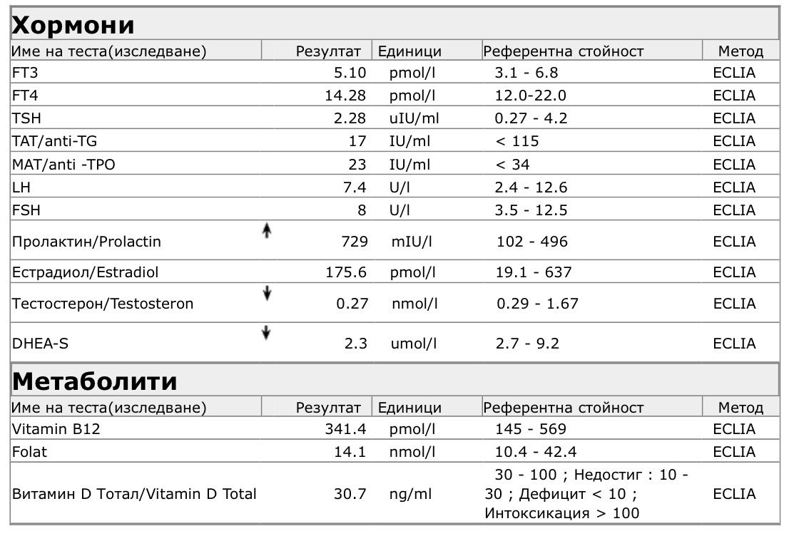 Здравей Денис.Отново ще те помоля да погледнеш резултатите ми.Последен цикъл на 15.03,положителен тест за овулация на 31.03...днес пуснах прогестерон...незнам дали избързах...до колкото разбрах се пуска 7 дни след евентуална овулация...и така го сметнах,че трябва днес да пусна..въпросът ми е според теб дали е имало овулация...неможах много да разбера,колко трябва да е прогестерона,за да показва,че е имало ову.Благодаря ти предварително...ето и резултатите ми...само да вметна с базед съм...от много години хормоните ми си стоят кротко на една таблетка тирозол...понеже целя забременяване ендото ми намали тирозола на 1/2 т. И свалихме тсх под 2...беше около 2.5...от 1 месец минах на половин т. Пропицил...мисля че хормоните на щз така са добре...