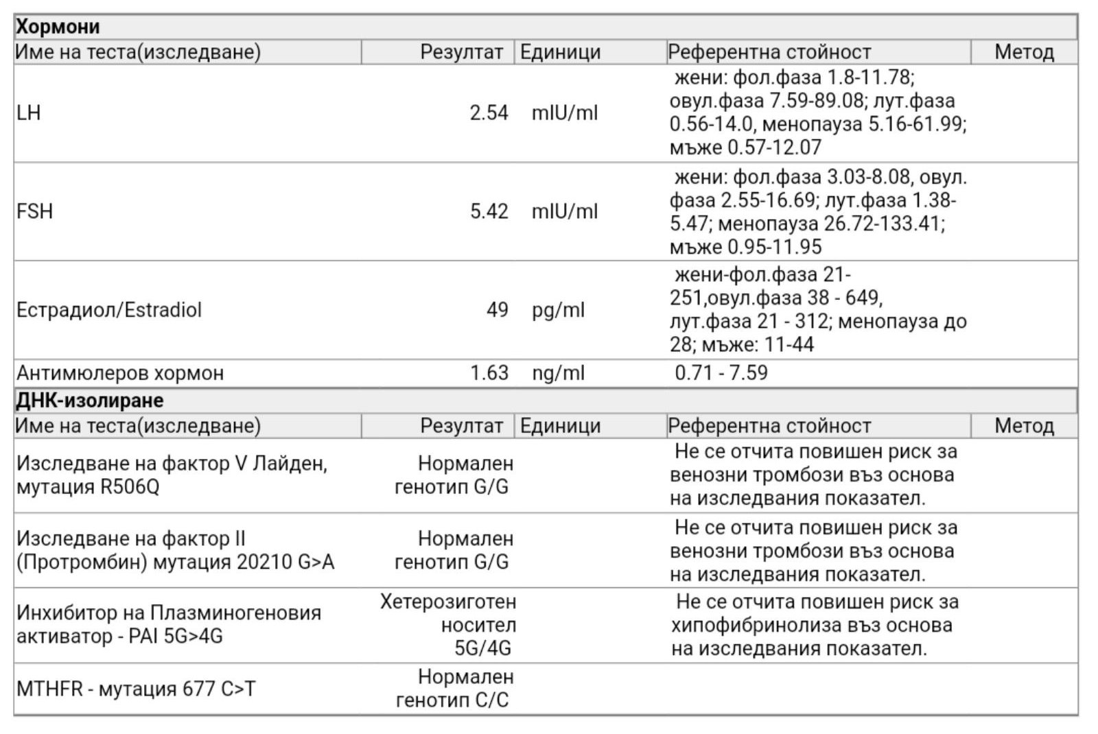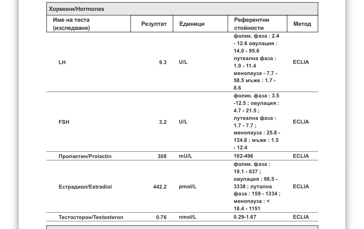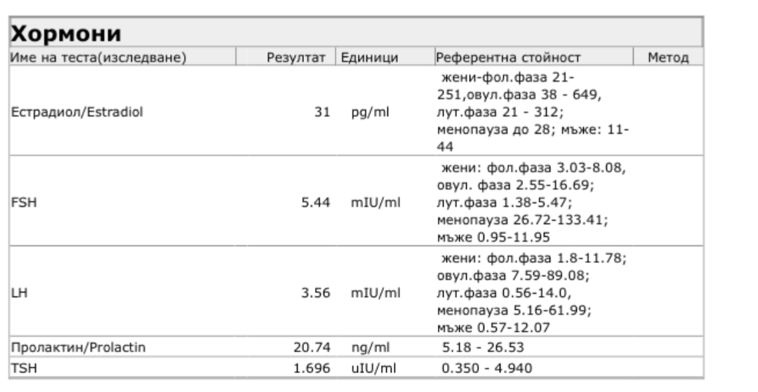 До тогава бих помолила за мнение и тълкуване на резултатите от изследванията, които съм си пускала последните месеци, които за съжаление чак сега видях, че не са оптимално направени в МЦ, и също ми липсва Inhibin B, който ще пусна пак с АМХ следващия цикъл. Също започнах да пия адекватни дози вит Д и Б12, защото мислех че съм ок преди да се зачета при вас Unamused