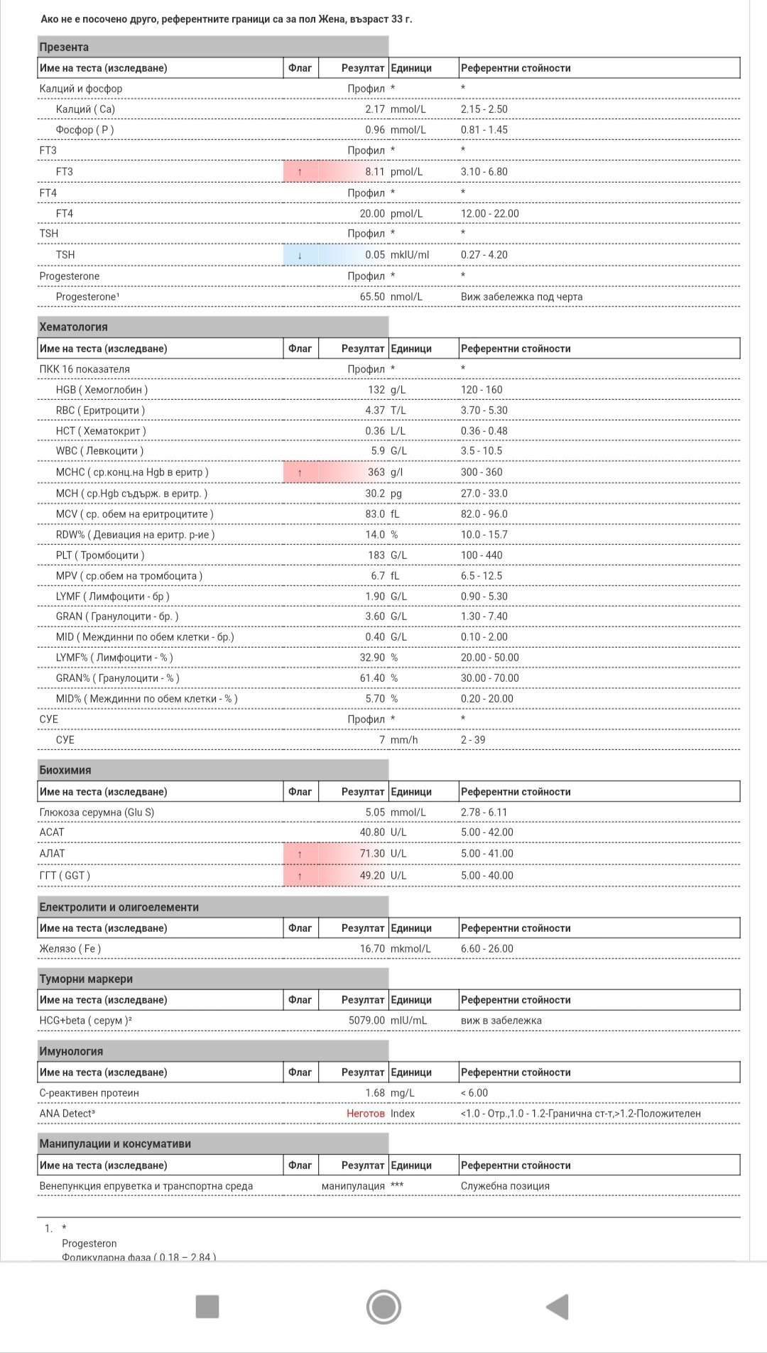 Здравей Денис.Ще те помоля за коментар на резултатите ми.С базед съм...от 5-6 години поддържам тсх между 2-2.5 с една таблетка тирозол на ден...след като реших да правя опити за бебе ендокринолога ми смени тирозола с пропицил и минах на 1/2 т пропицил на ден за да свалим тсх под 1...за около месец и половина тсх падна до 0.2...също така ми скочиха малко чернодробните...тъкмо се нормализираха чернодробните  и минах на 1 т пропицил на ден от 10 .05 ...последна М на 15.04...положителен тест за бременност на 15.05...още не съм ходила на АГ...разбрахме се с ендокринолога контрола на хормоните след 15 дни ..аз ги пуснах днес на 13тия ден от както съм на 1т пропицил...притесняват ме отново чернодробните и това че тсх продължава да пада ..незнам дали мога да пия карсил по време на бременност...ето резултатите ми от 10.05 и от днес...също така как ти се вижда прогестерона?