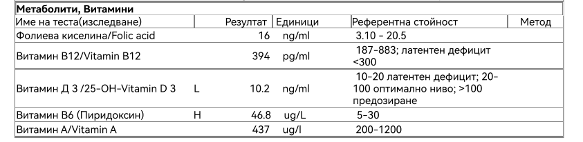 Имаш дефицит на вит. Д, а В12, ФК, вит. А са ниски... трябва да ги приемаш. В6 е висок -  ако си приемала някакви добавки с него, може да е от това... не е проблем.