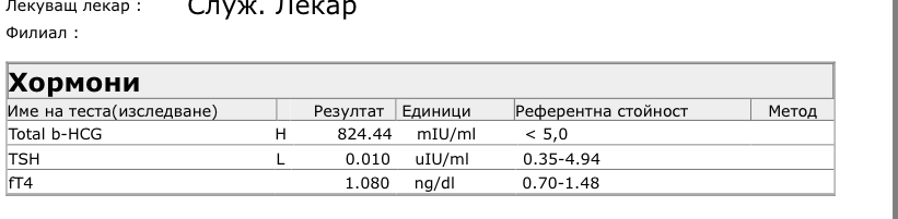 Здравейте, на 23 май след положителен домашен тест за бременност си пуснах кръвен- резултатът беше 318. Днес(след 48ч) стойността е 824, но понеже имам проблеми с щитовидната жлеза пуснах и ТСХ и ФТ4, според вас как са резултатите?