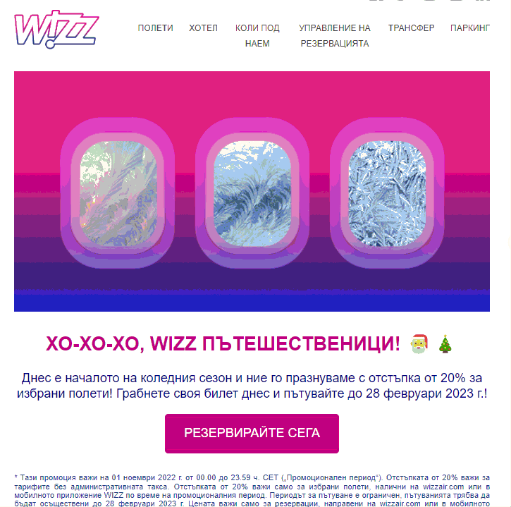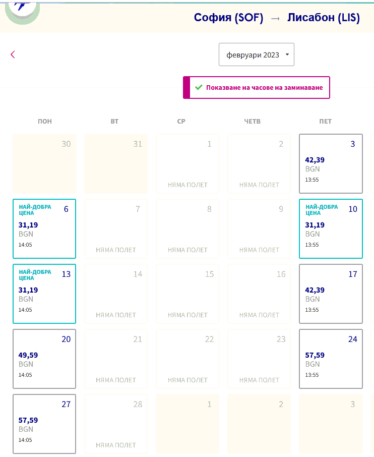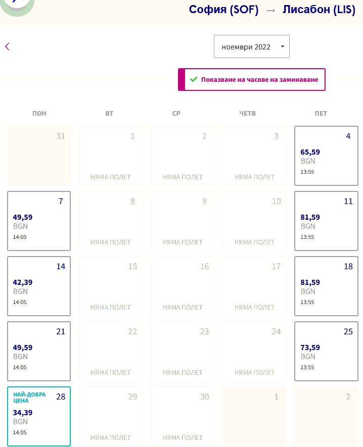 Промоцията за днес не е никак лоша. Сега видях до Лисабон: 34 лв за 28 ноември и по 31 лв за 12 декември, 30 януари, 6, 10, 13 февруари. И на връщане има такива цени, 20, 27, 30 януари, 10 февруари и т.н.