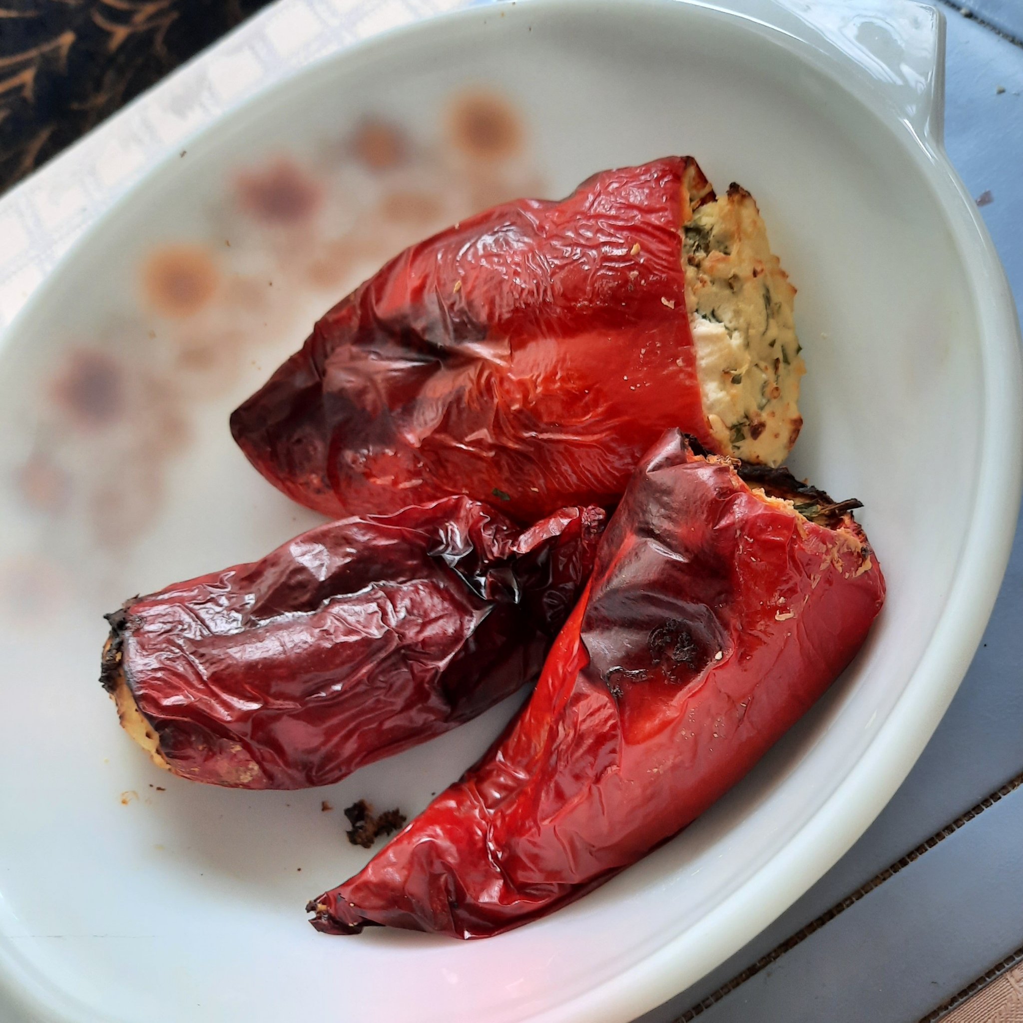 Аз пекох червени чушки във фрайера, пълнени с извара, яйца, малко бадемово брашно, сложих и прословутата хранителна мая, малко зехтин и магданозззз.