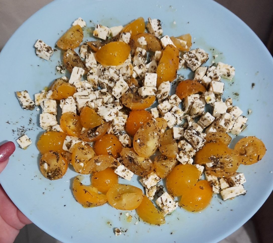 Предястие😄 от сирене, жълти чери доматчета, зехтин, чубрица и чесън на прах (изглежда някак повече като количество на снимката):