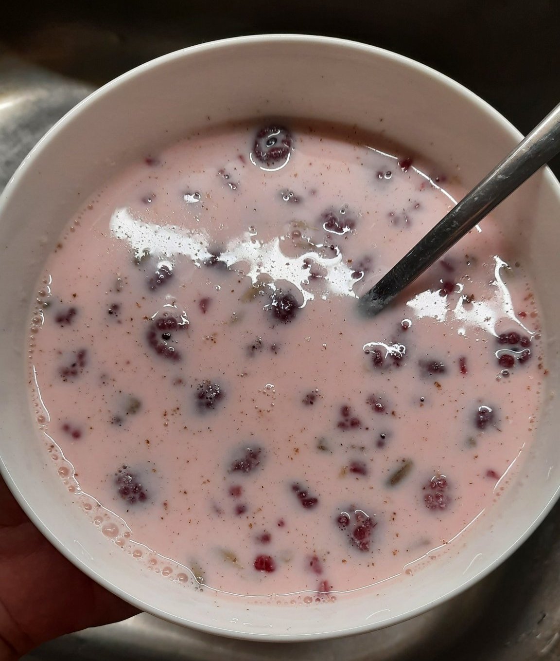 Кефир с малини, сурови слънчогледови семки, цейлонска канела и малко вода (за запълване на купата):