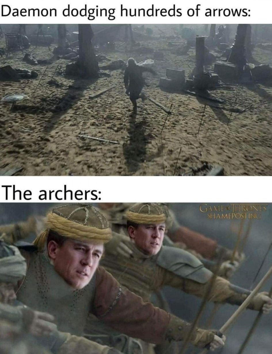 А те като в холивудски екшън - стрелите не го ловят, а хората  тръгват по 3-4 ма срещу него, като се изчакват да са  един след друг за да може да ги посича с меча си.