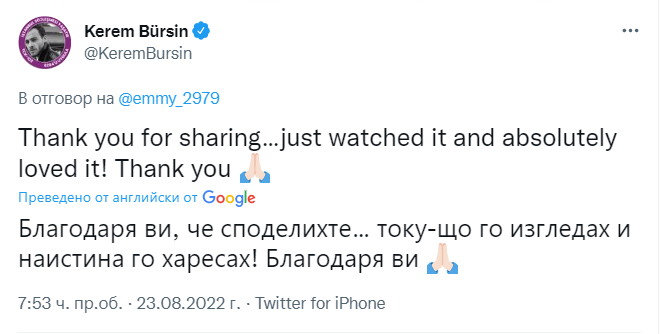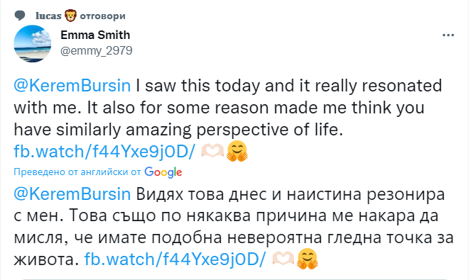 Тази негова вярна последователка Емма Смит вчера се е обърнала към него с молба да изгледа този клип, в който се засягат проблеми, които живо вълнуват и самия Керем. Той съответно го е видял и веднага е оговорил, като е благодарил.  Такъв е Керем, социален и много земен.