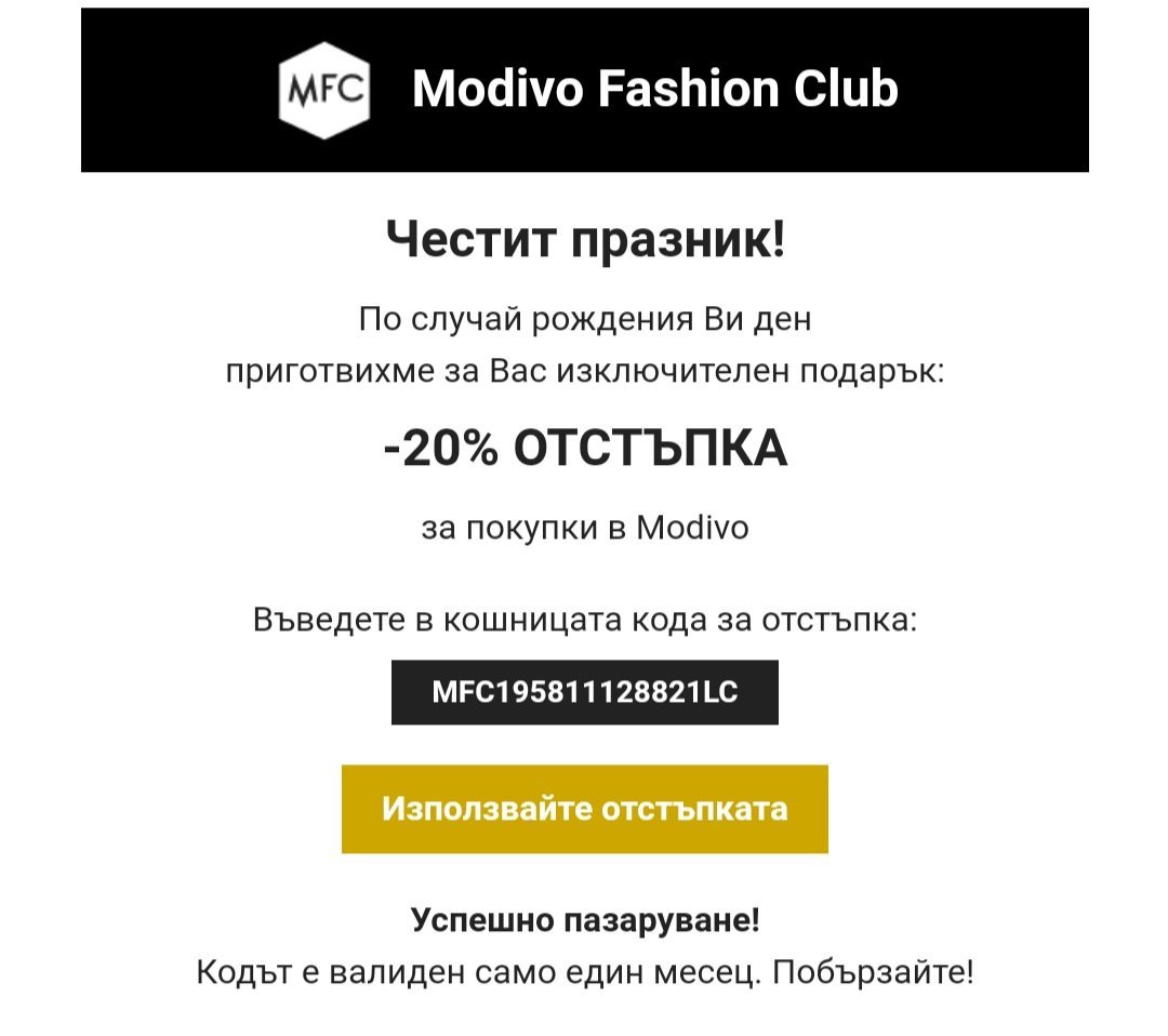 Кодът е за Modivo, валиден за ненамалени артикули до 24.09.22.