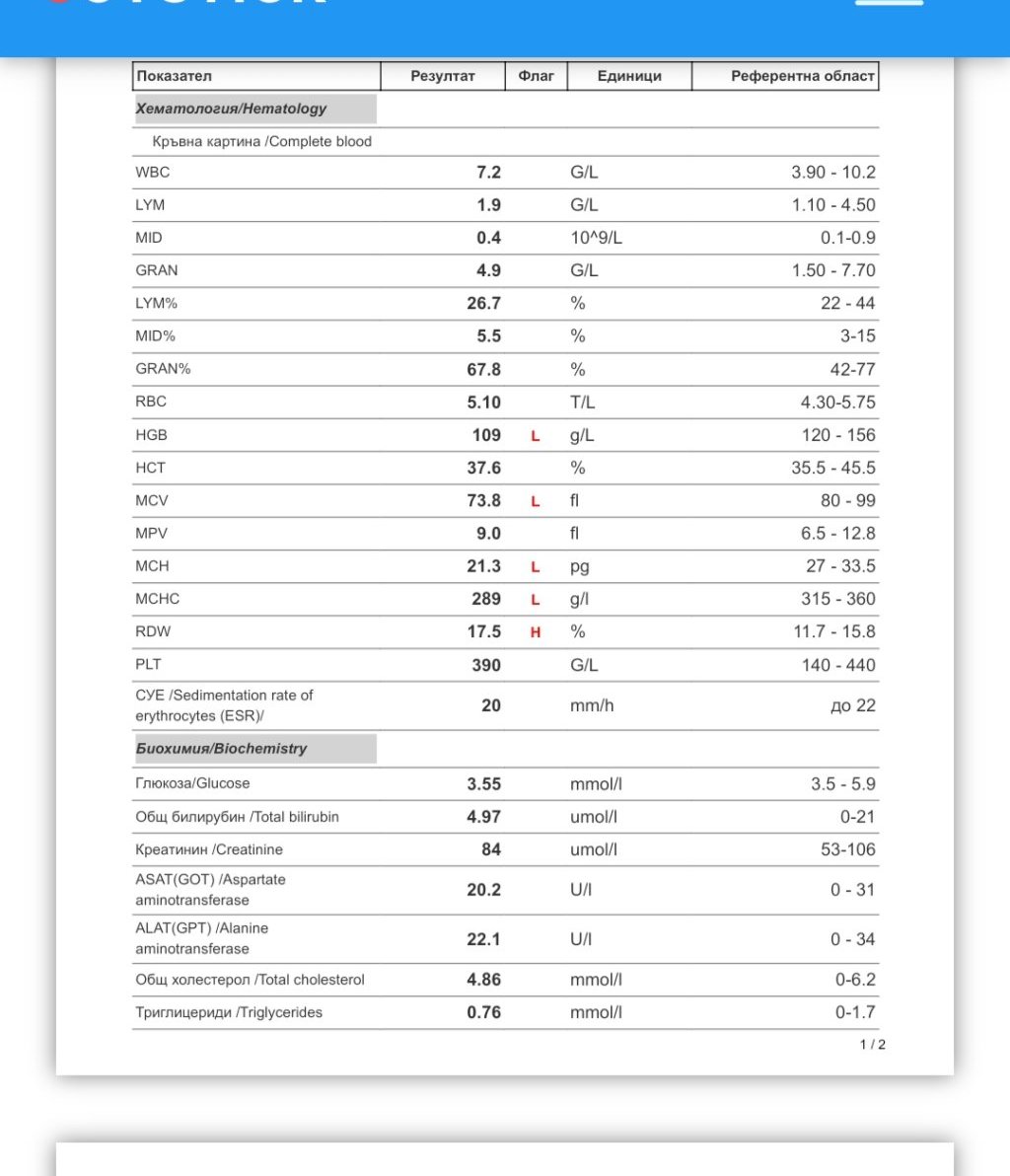 Допълвам и феритин. При мен при нормален хемоглобин, желязото беше на долна граница, но феритинът беше със сериозен дефицит. ЖСК също да се изследва.