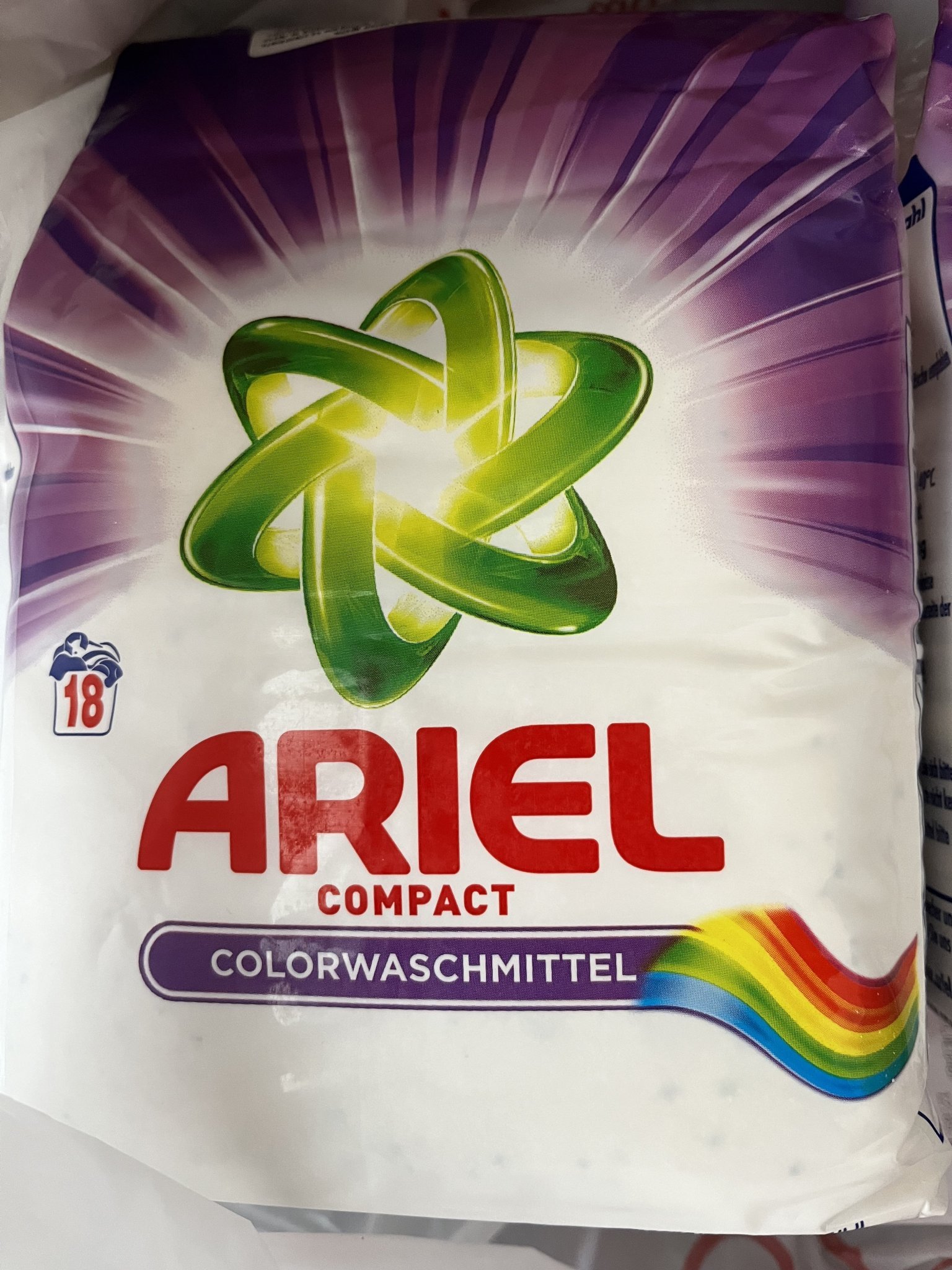 Ariel Compact за цветно, немски 18 пранета= 7.49 лв във Фантастико. Срок на годност- ноември 2023. Взех си.