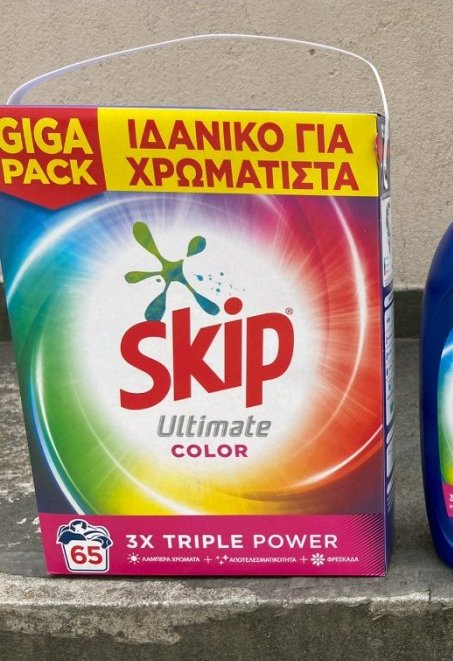И синята,и зелената кутия Скип е с кислородни избелители(5-15%),т.е. за бяло,но същият производител(Unilever) има и друг прах за пране(Klinex) с повече кисл.избелители(15-30%),който е по-подходящ за бяли дрехи.Вече има и Skip ultimate color,който е за цветно.Всички Скип(Клинекс също) се продават в магазините за паралелен внос и в Гърция,Испания,Франция.