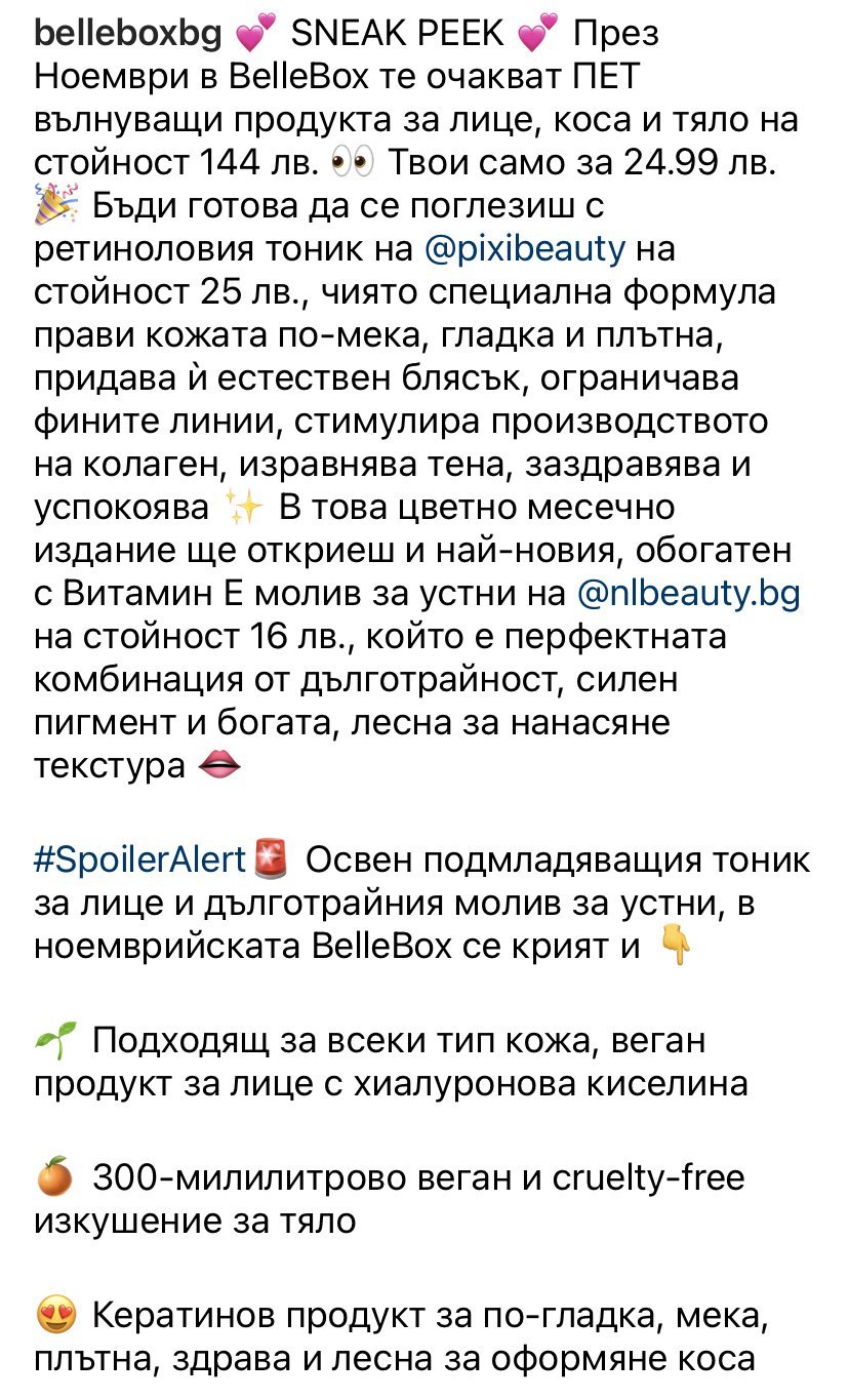 Аз поръчах коледната. Последните кутии им бяха страхотни, а тази за ноември изпуснах и много ме е яд, защото има пачове за очи голяма кутия.