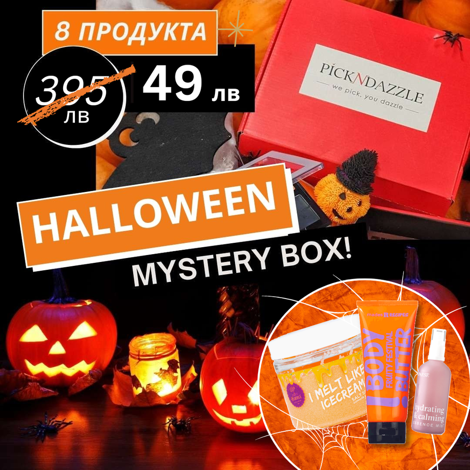 в Мистериозната кутия Хелоуин ще откриеш нови продукти, като ХИДРАТИРАЩА ЕСЕНЦИЯ СПРЕЙ от PAESE, СКРАБ ЗА ТЯЛО BUBBLE SALT ORANGE 200 гр, МАСЛО ЗА ТЯЛО FRUITY FESTIVAL и още 5 пълноразмерни продукта за грижа за кожата, тялото и косата, както и грим, разбира се!  🎃🎃🎃