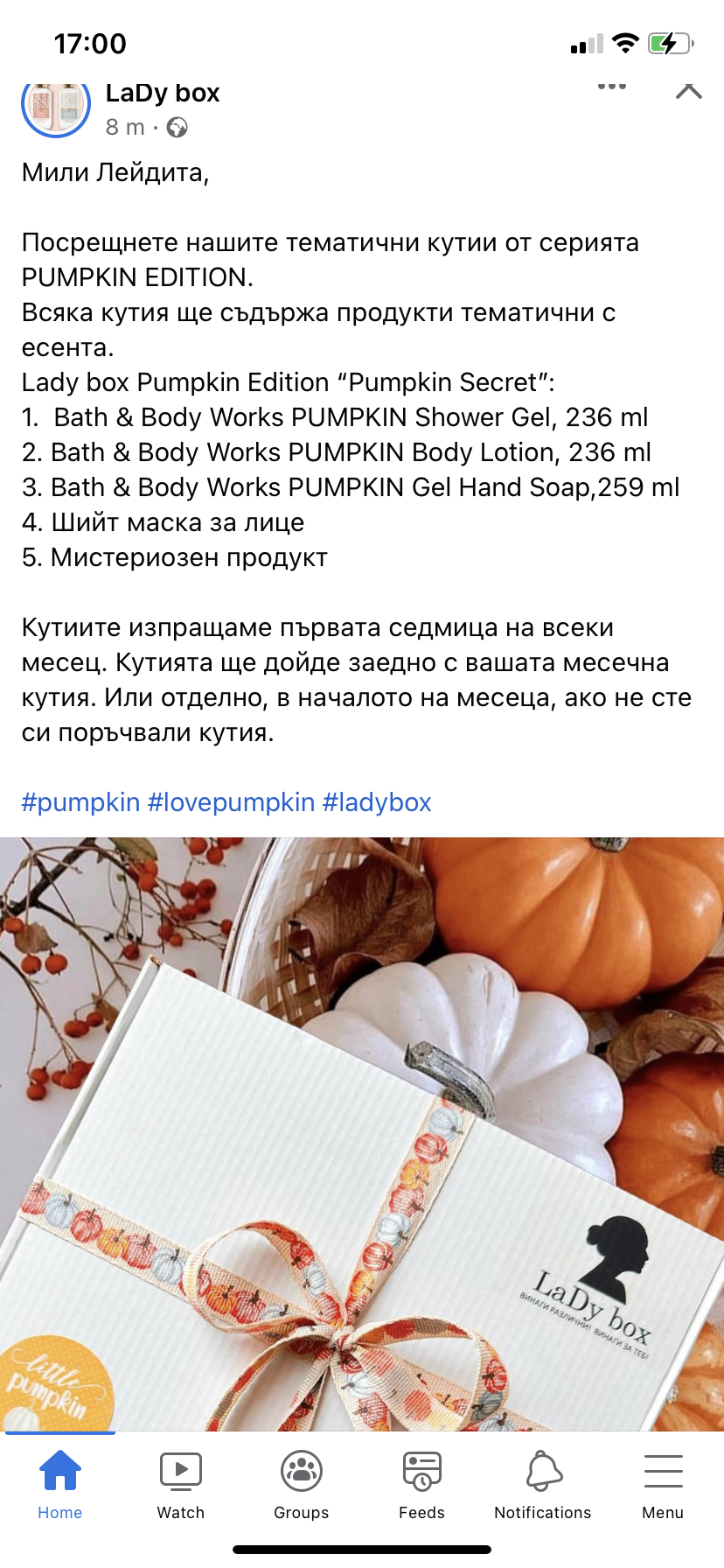 Много изкушаващо изглежда кутията. Не съм поръчвала от тях, бързо ли се изчерпват тематичните им кутии или имам време да я мисля 😁 И обмислям най-вече дали точно ароматът на тиква е този, с който да рискувам 🤔...а дали пък по Коледа няма да има отново продукти на BBW?