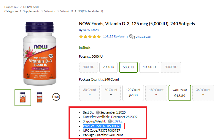 Product Code: NOW-00373  .... за NOW Foods, Vitamin D-3, 125 mcg (5,000 IU), 240 Softgels
