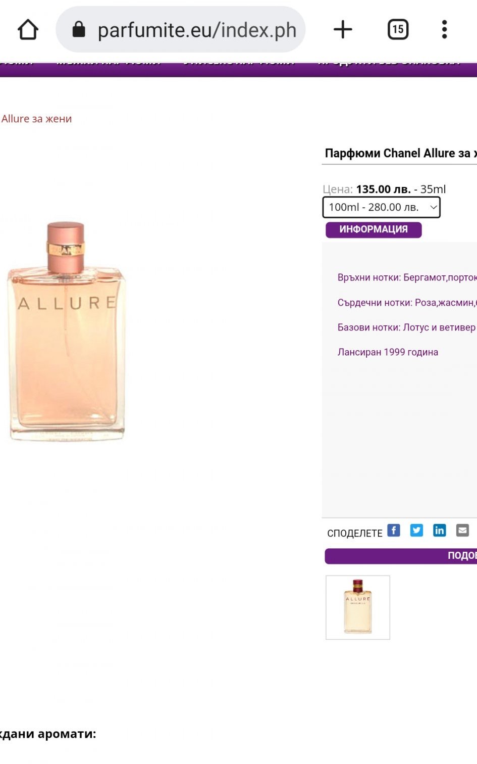 Виждам ,че са отбелязани 100-те мл.В makeup го има на същата цена и е по сигурно https://makeup.bg/product/1240/ пп.Подведох не е същия.Тук го има 35 мл. https://www.perli.bg/chanel-allure-%D0%BF%D0%B0%D1%80%D1%84%D1%8 … p-35-%D0%BC%D0%BB .Сайта е надежден.Давам и код за -3% JJ3KFM.