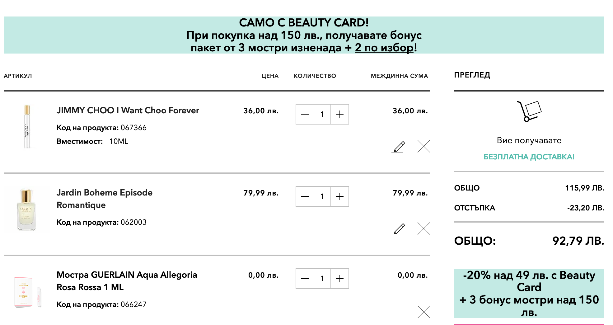 Нещо, което не ми направи добро впечатление: вчера гледах цената в Дъглас на JIMMY CHOO Iris Crush - беше 390 лв, а днес е 414 лв.
