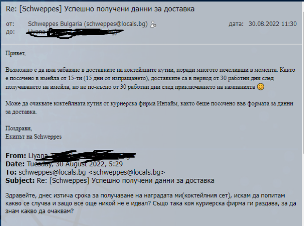 Кофти, че не сте получила отговор, но ако не е изтекъл срока за доставка  е бил малко безсмислен имейла, като моя. Но все пак писах от страх малко, защото наградата си е награда спечелили сме си я, а и си заслужава! Ето го и моя имейл, малко съм в грешка, защото не бях пресметнала от паниката срока и прибързах! Но пак казвам, днес като звъннах казаха, че ако изтече срока и не съм го получила да се обадя за ревизия.