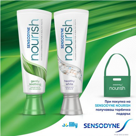 Купи Sensodyne Nourish Healthy White или Sensodyne Nourish Gently Soothing от Лили Дрогерие в Сердика център  и вземи брандирана торбичка за пазаруване!