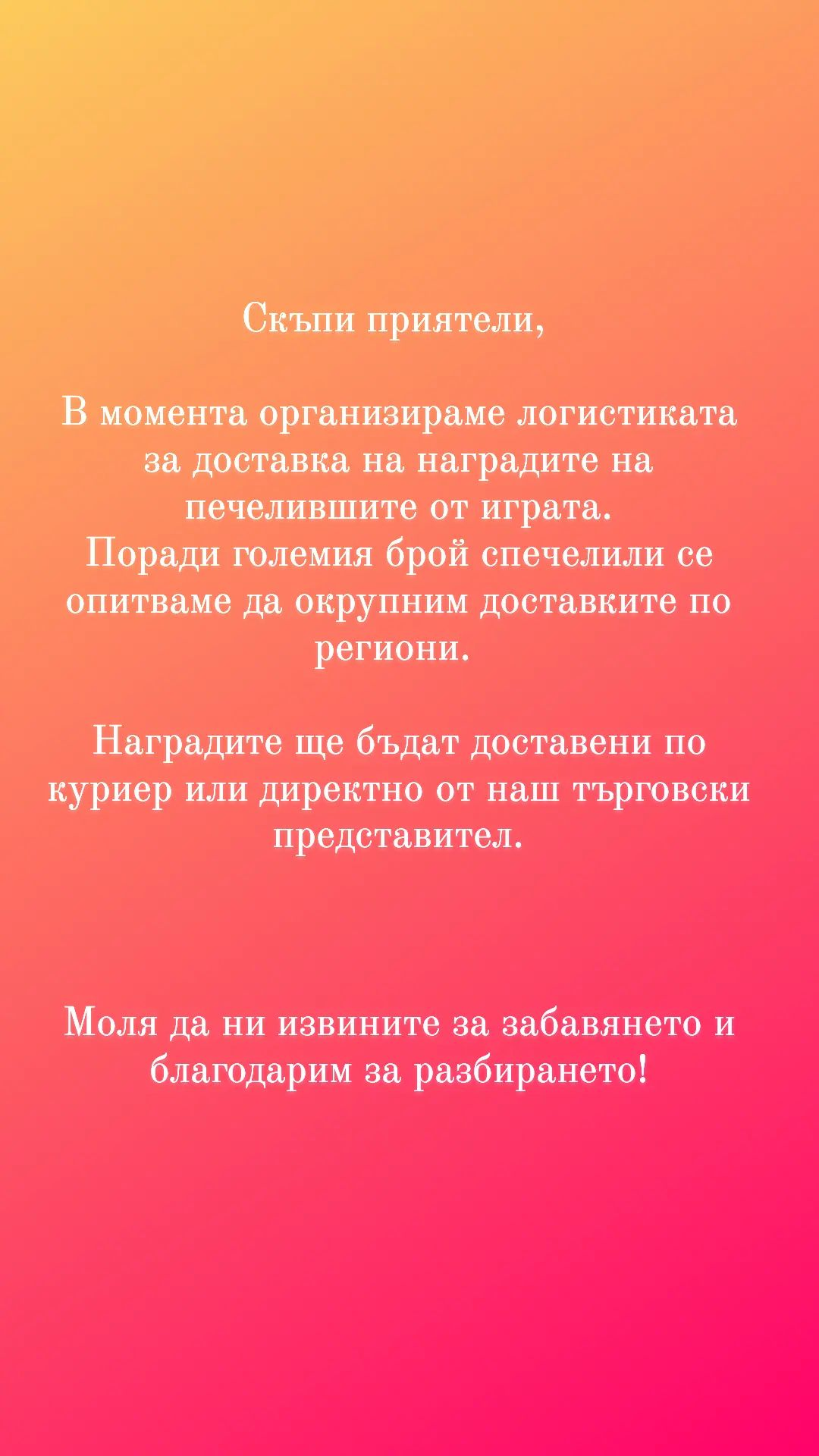 За моята награда от швепс в КК ми отговориха, че наградата е върната при тях защото куриер ме бил търсил няколко пъти и мен ме нямало на адреса, което не е вярно. Нямам смс, обаждане, нищо. Куриерът не бил ин тайм, а друг, но не казват кой. Сега отново очаквам наградата си, вече трети месец тече.......... Поне да кажат кой куриер ги носи за да мога да си я потърся сама.