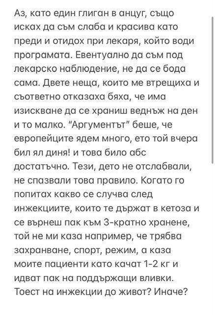 Българин е лекарят, но да, идеята на инжекциите е да издържиш само на диня. Ако хапнеш нормално, ти става лошо. Реално живееш само на инжекции, но докога?