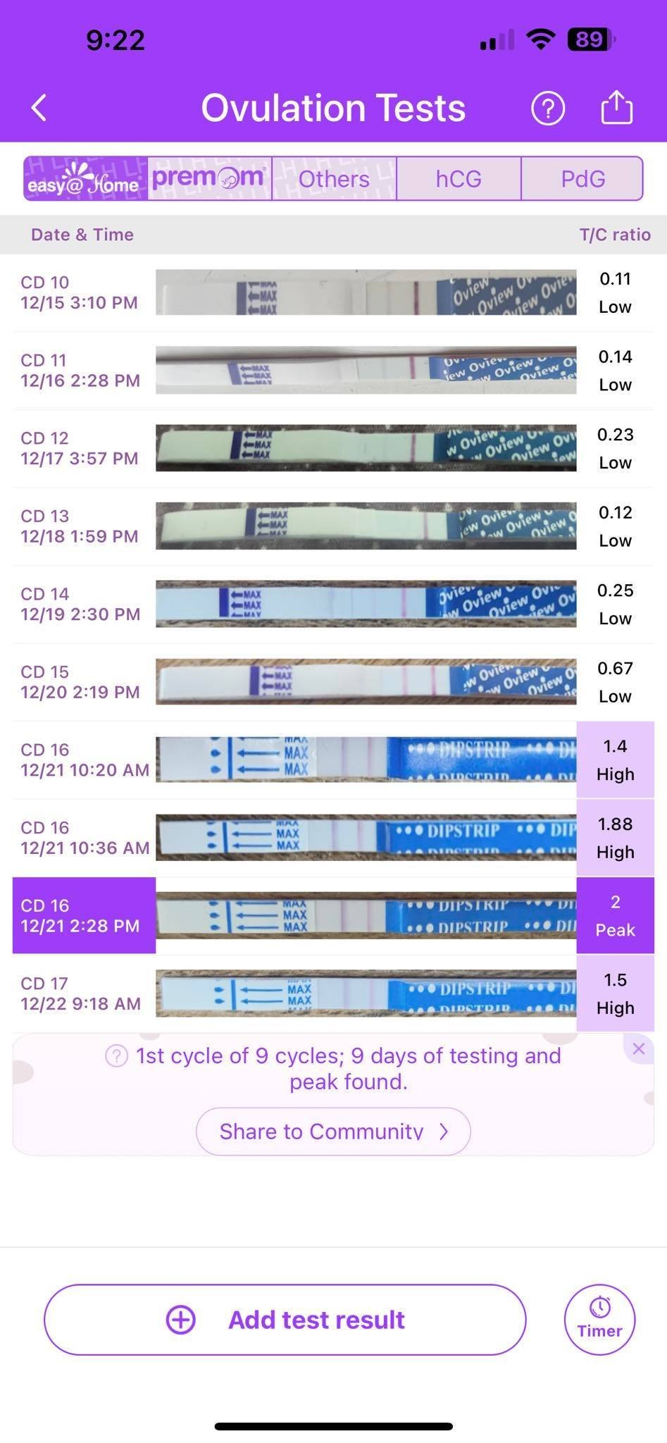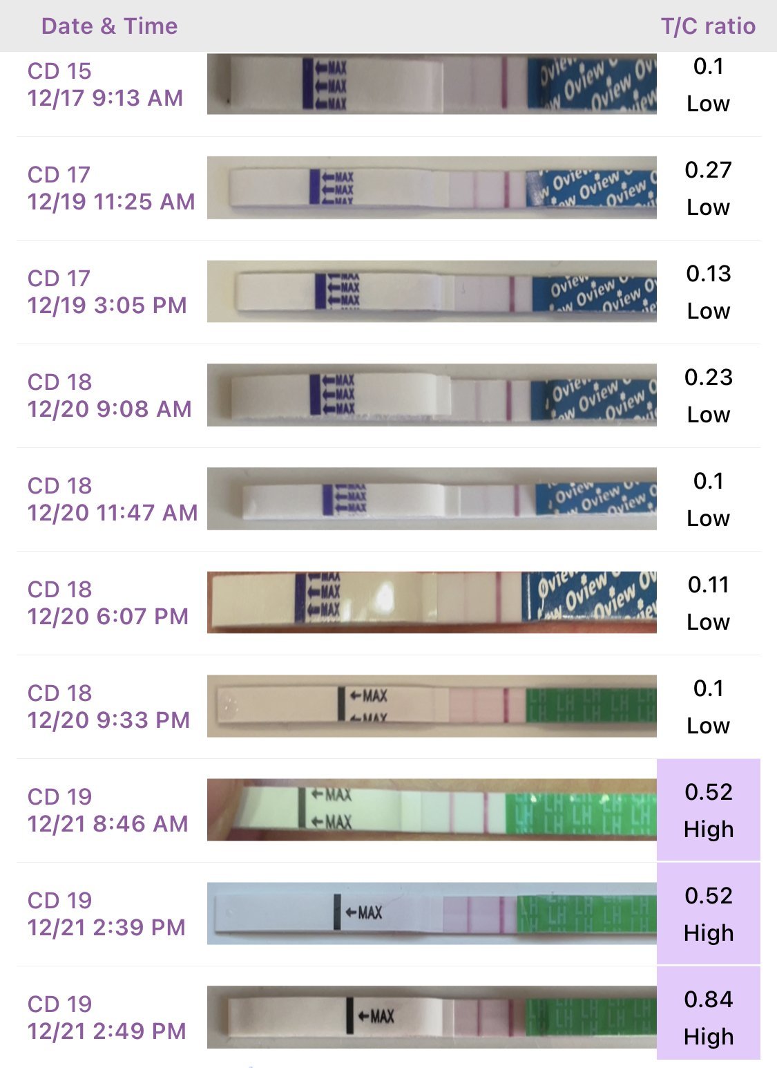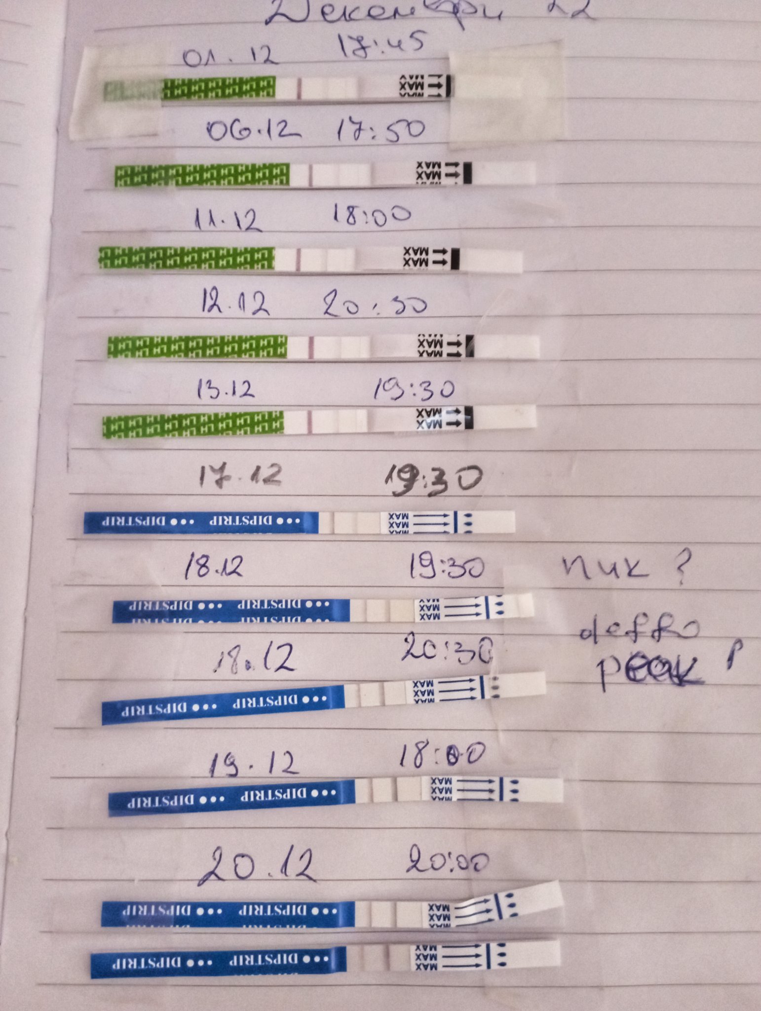 Мислех че съм изпуснала пика този месец, защото ми свършиха лентичките на 16 ден и тогава имах болки като при овулация. Въпреки това продължих да тествам и мисля, че днес вече е (почти) положителен? Последните 3 са от днес.