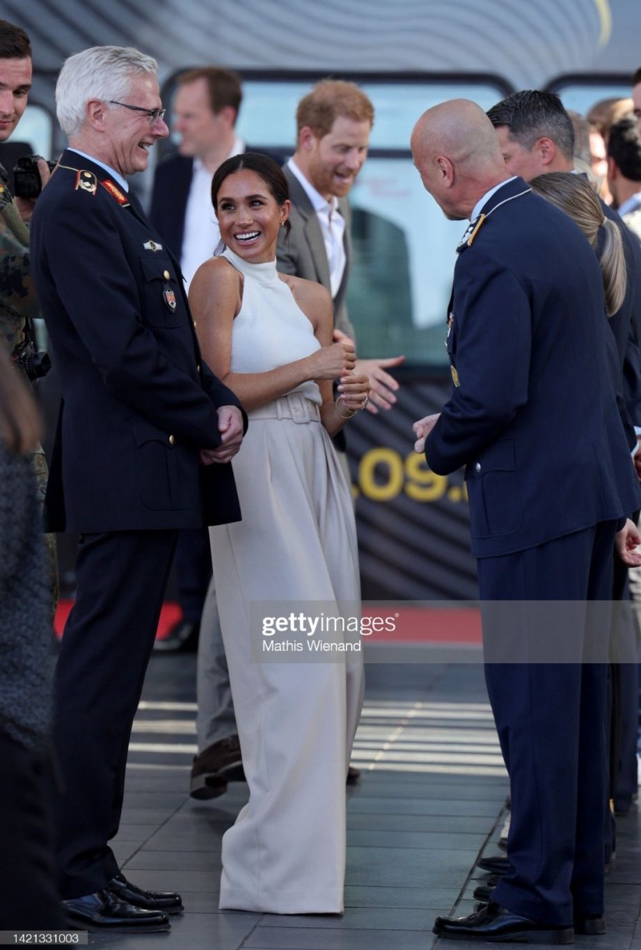 Много ми харесва днешният тоалет на Мегън, особено блузата/потник, каквото е. Харесвам бяло със светлобежово. Панталонът също стои добре. Само белите обувки са ми твърдо не.
